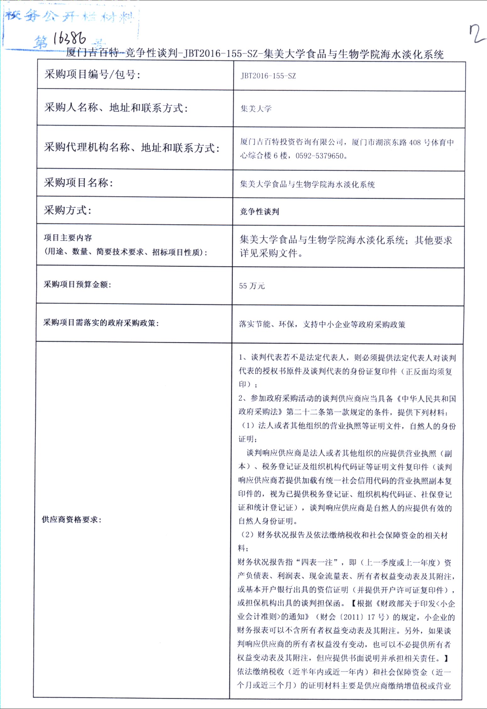 厦门吉百特—竞争性谈判—JBT2016—155—SZ—集美大学食品与生物学院海水淡化系统