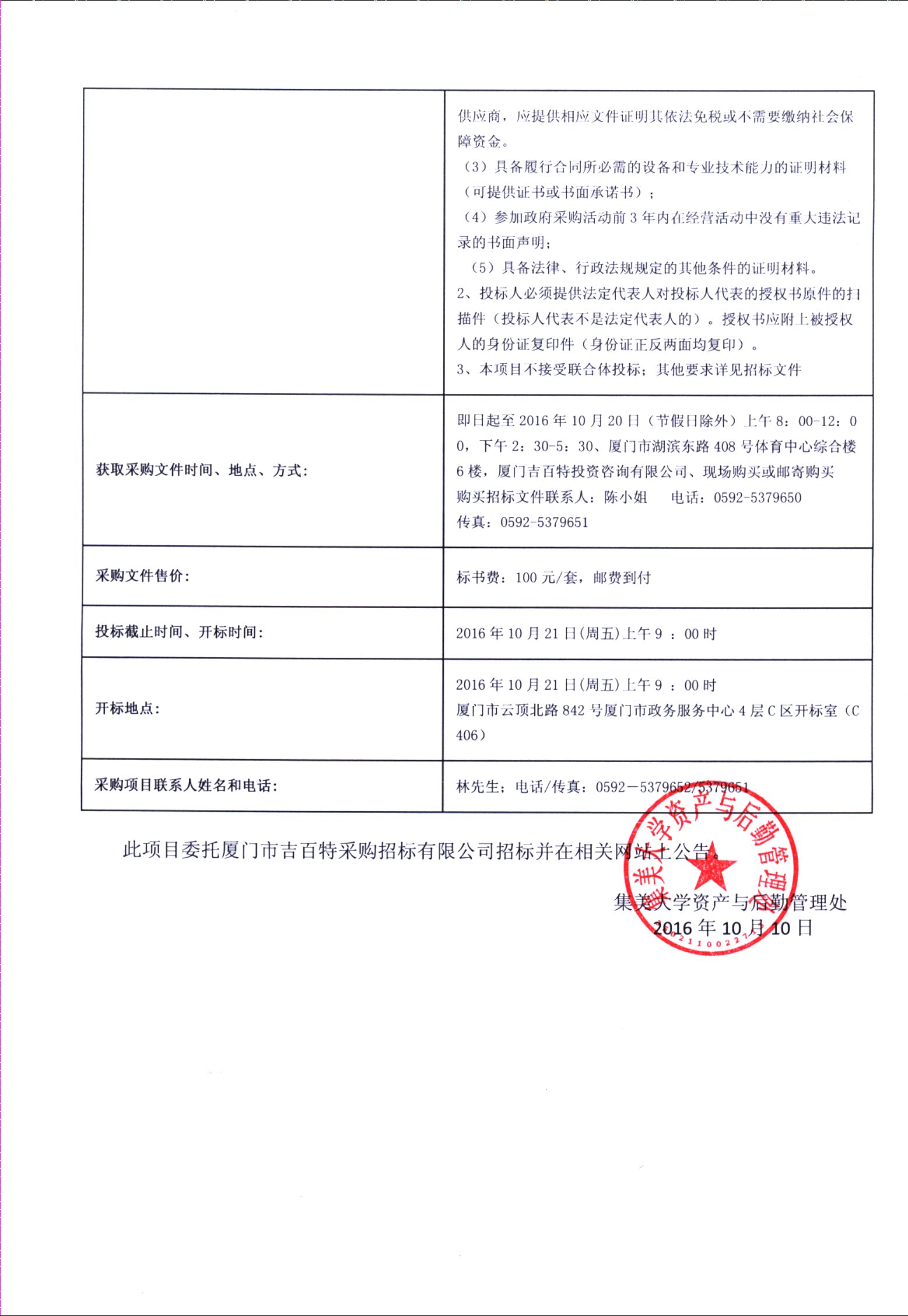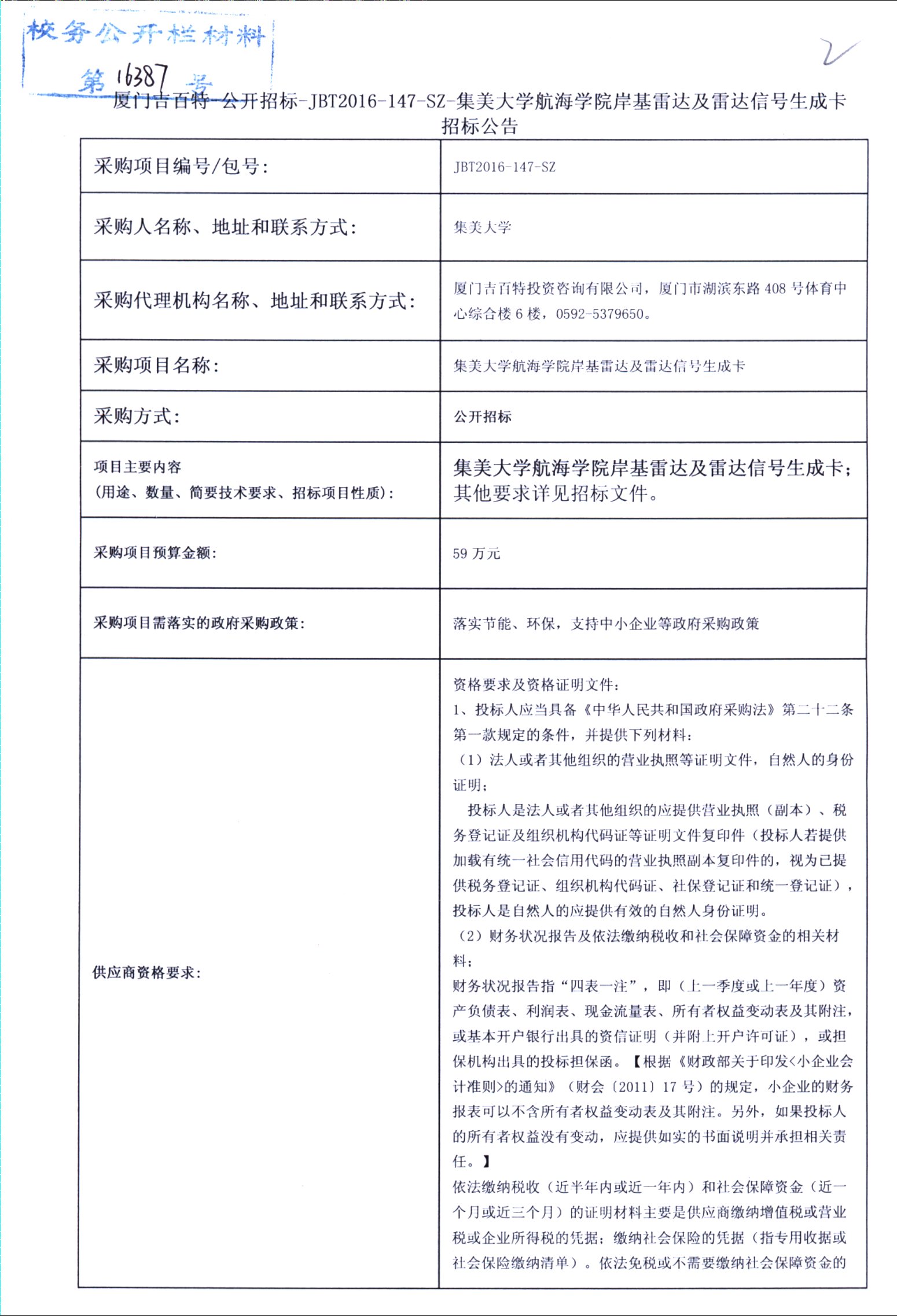 厦门吉百特—公开招标—JBT2016—147—SZ—集美大学航海学院岸基雷达及雷达信号生成卡招标公告