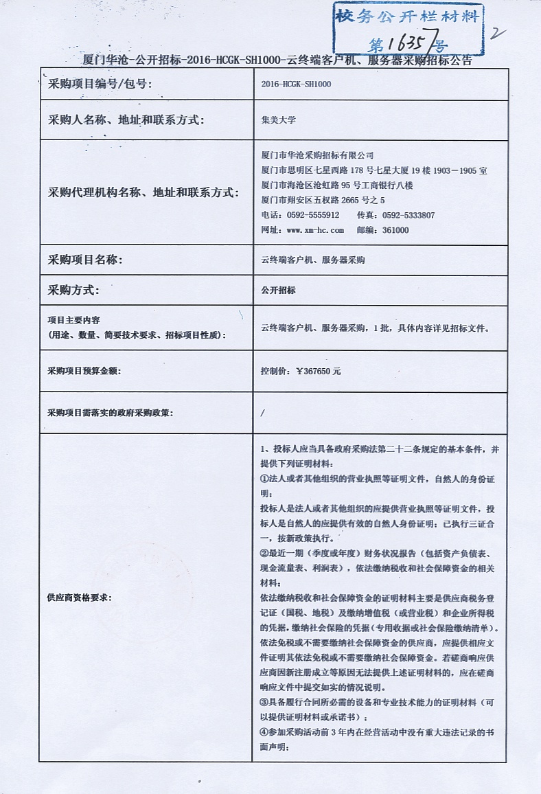 厦门华沧—公开招标—2016—HCGK-SH1000-云终端客户机、服务器采购招标公告