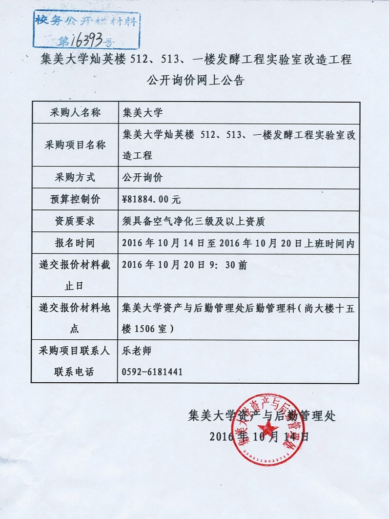 集美大学灿英楼512、513、一楼发酵工程实验室改造工程公开询价网上公告