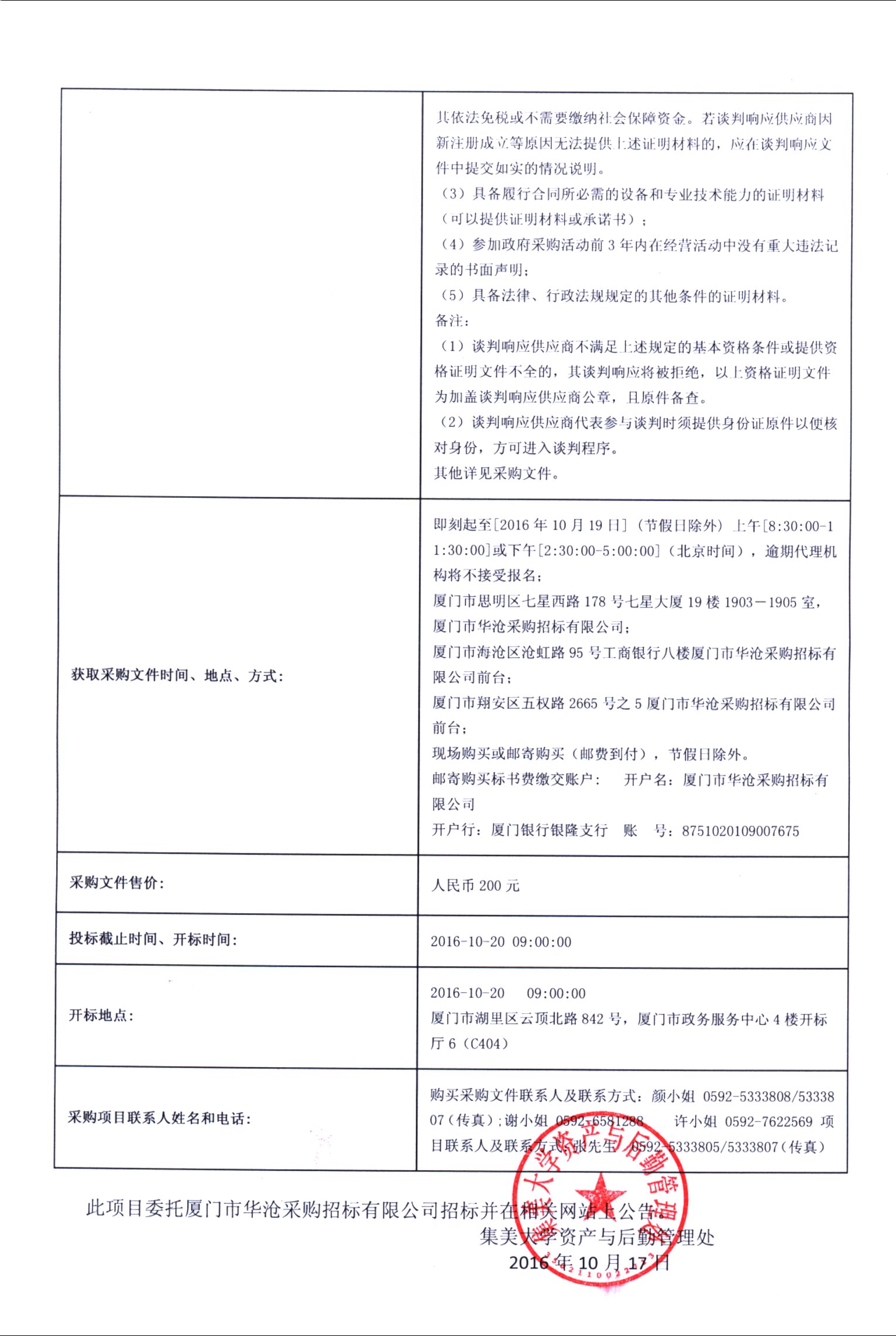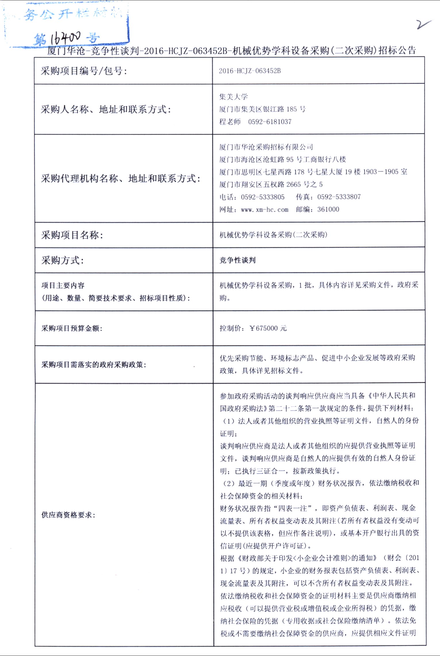 厦门华沧—竞争性谈判—2016—HCJZ—063452B—机械优势学科设备采购(二次采购)招标公告