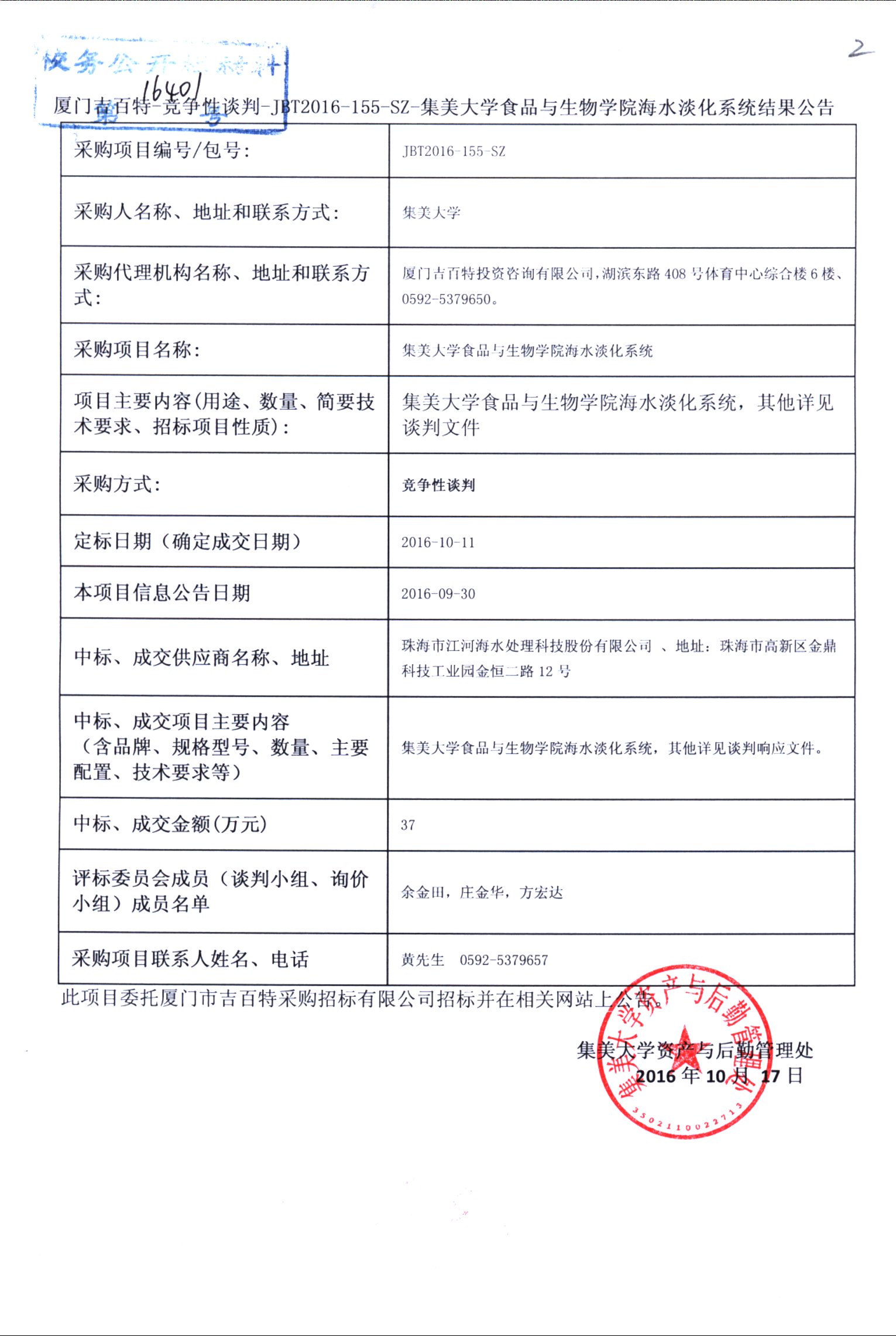 厦门吉百特—竞争性谈判—JBT2016—155—SZ—集美大学食品与生物学院海水淡化系统结果公告