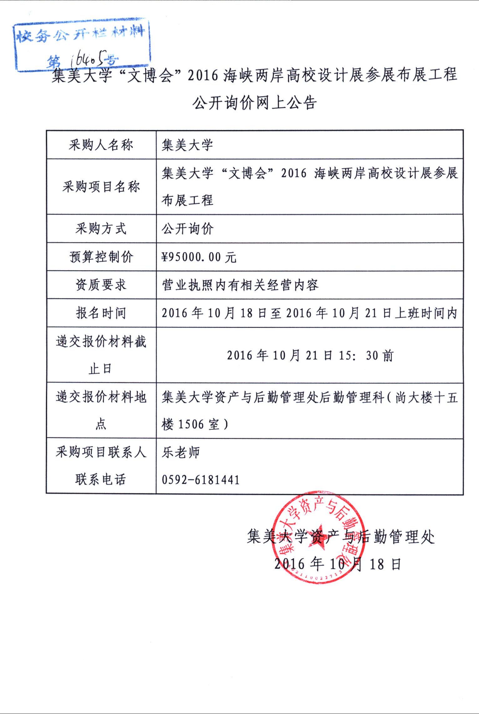 集美大学“文博会”2016海峡两岸高校设计展参展布展工程公开询价网上公告