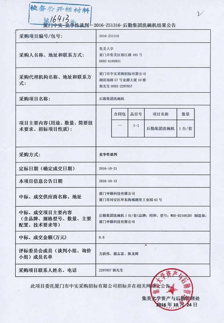 厦门中实—竞争性谈判—2016—ZS1316-后勤集团洗碗机结果公告