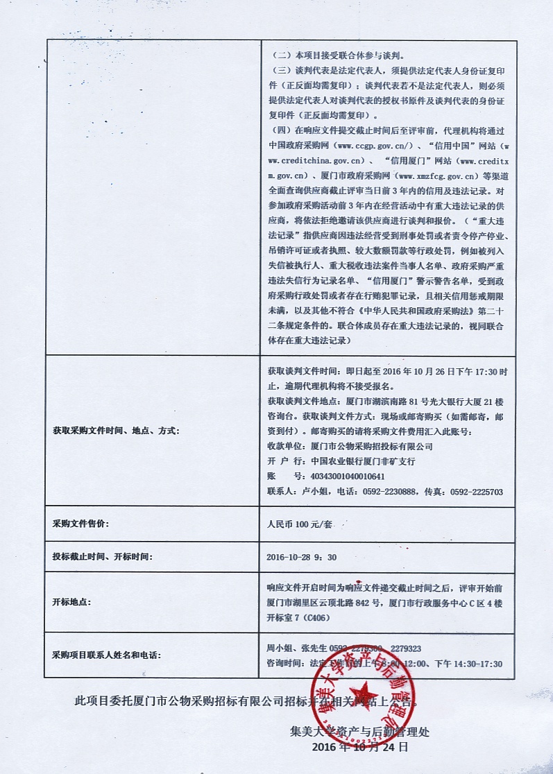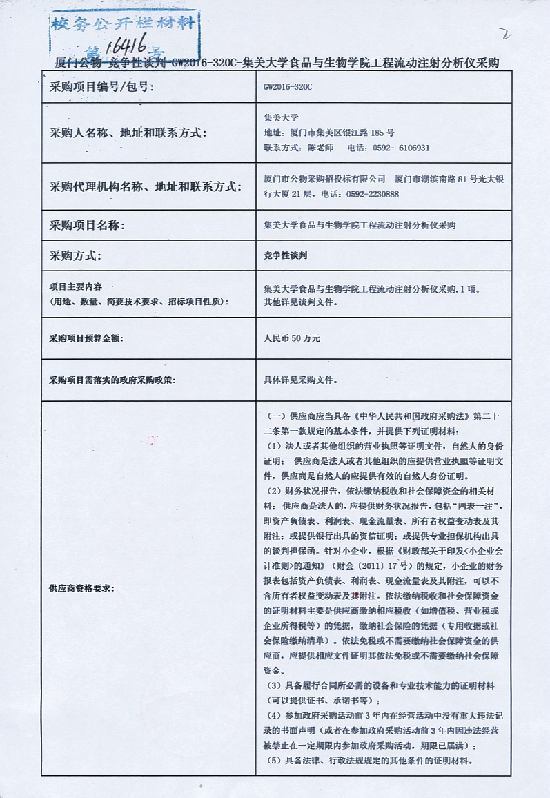 厦门公物—竞争性谈判—GW2016-320C-集美大学食品与生物学院工程流动注射分析仪采购