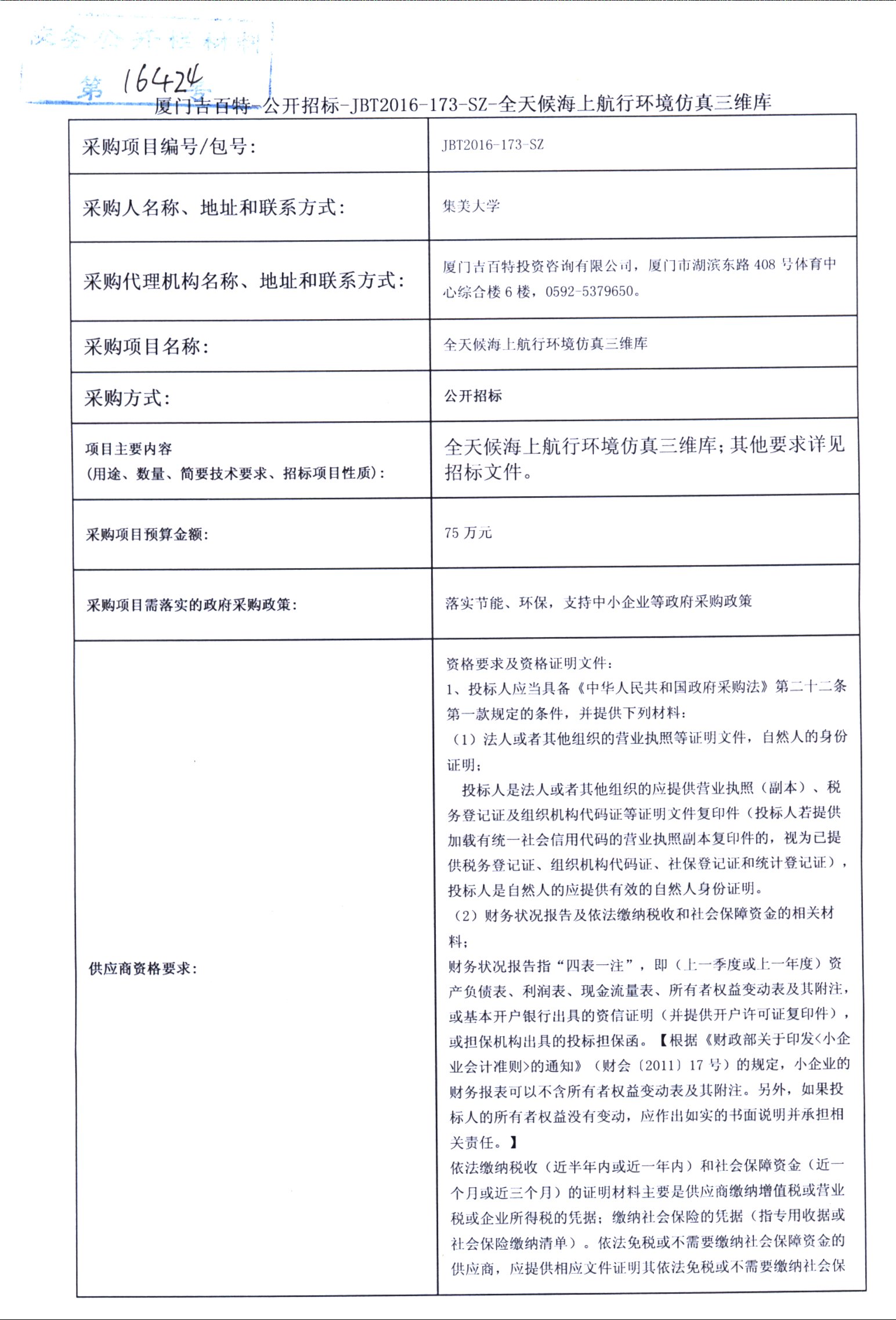 厦门吉百特—公开招标—JBT2016-173-SZ-全天候海上航行环境仿真三维库