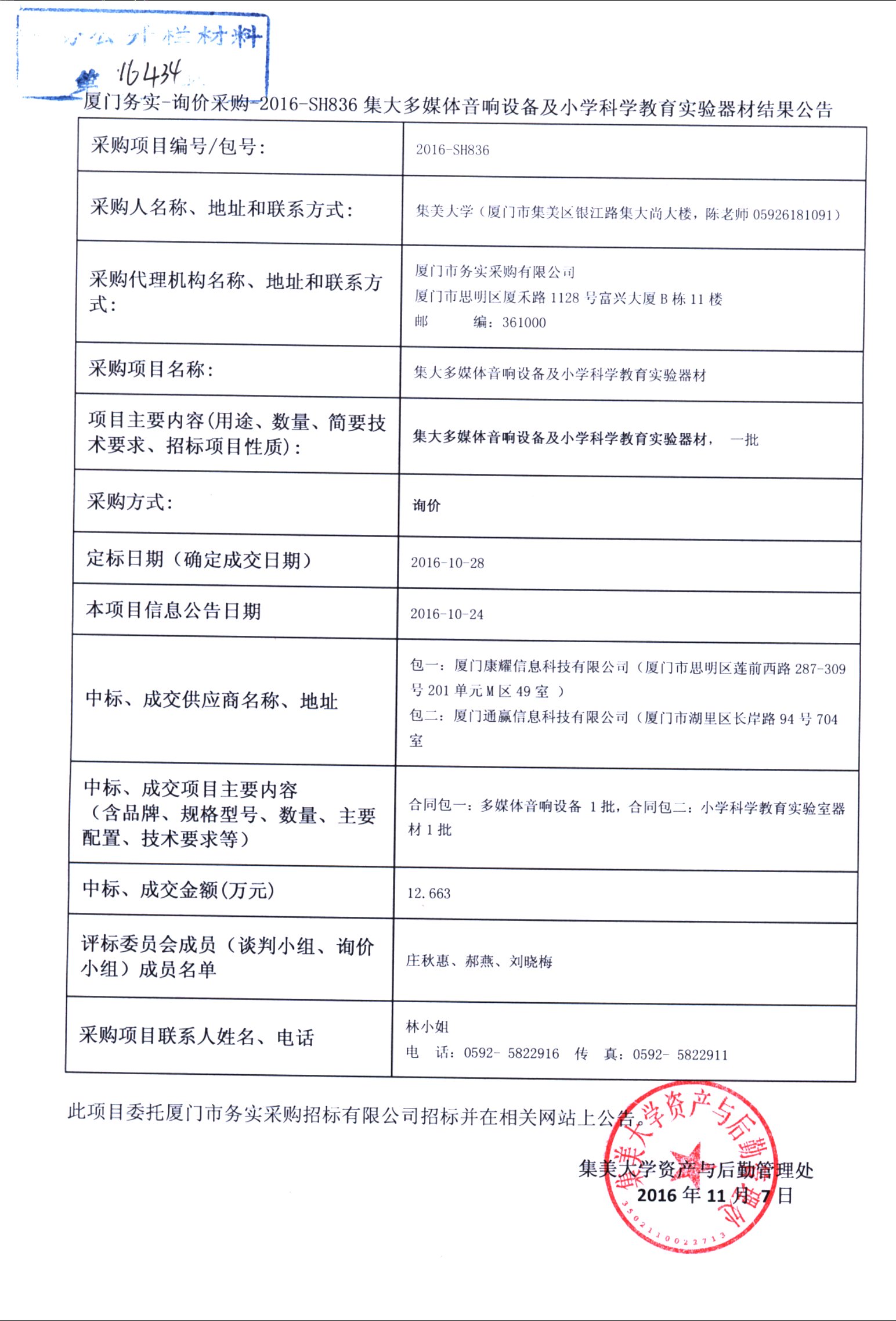 厦门务实—询价采购—2016-SH836集大多媒体音响设备及小学科学教育实验器材结果公示