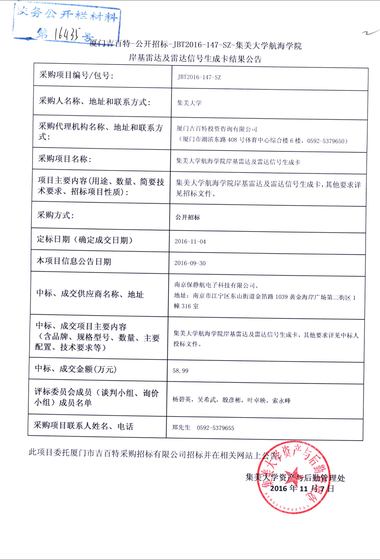 厦门吉百特-公开招标-JBT2016-147-SZ-集美大学航海学院岸基雷达及雷达信号生成卡