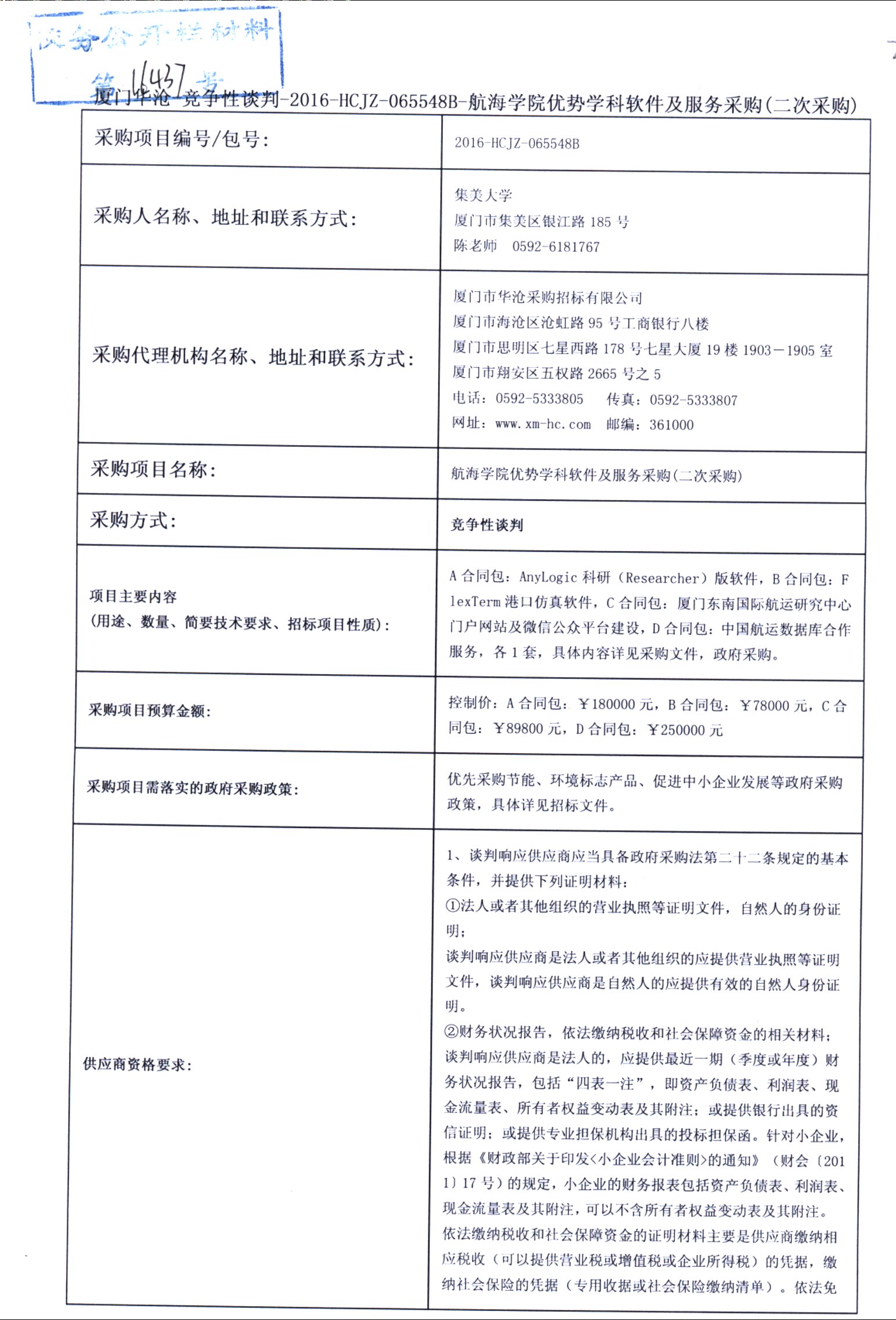 厦门华沧-竞争性谈判-2016-HCJZ-065548B-航海学院优势学科软件及服务采购(二次采购)