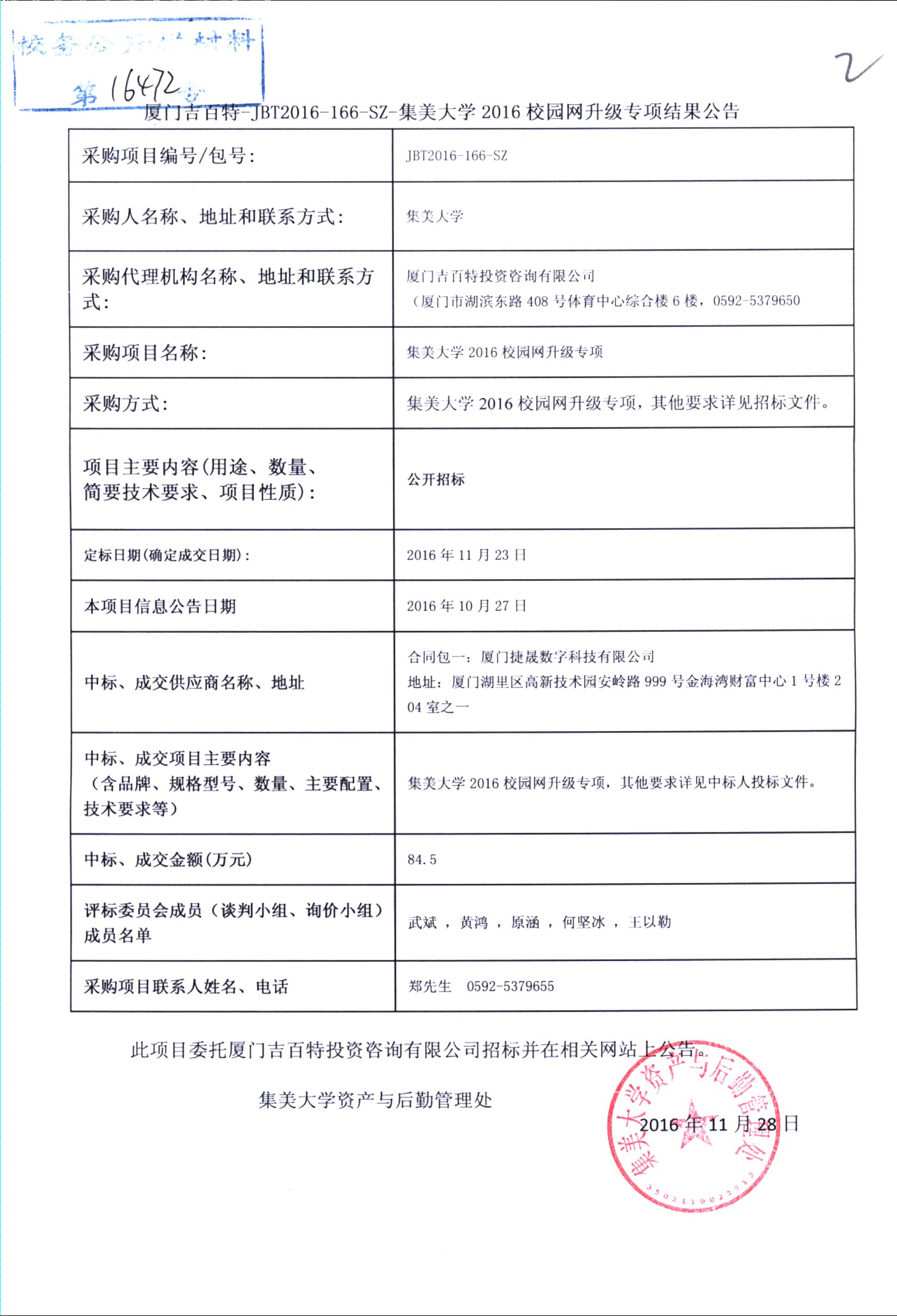 厦门吉百特-JBT2016-166-SZ-集美大学2016校园网升级专项结果公告