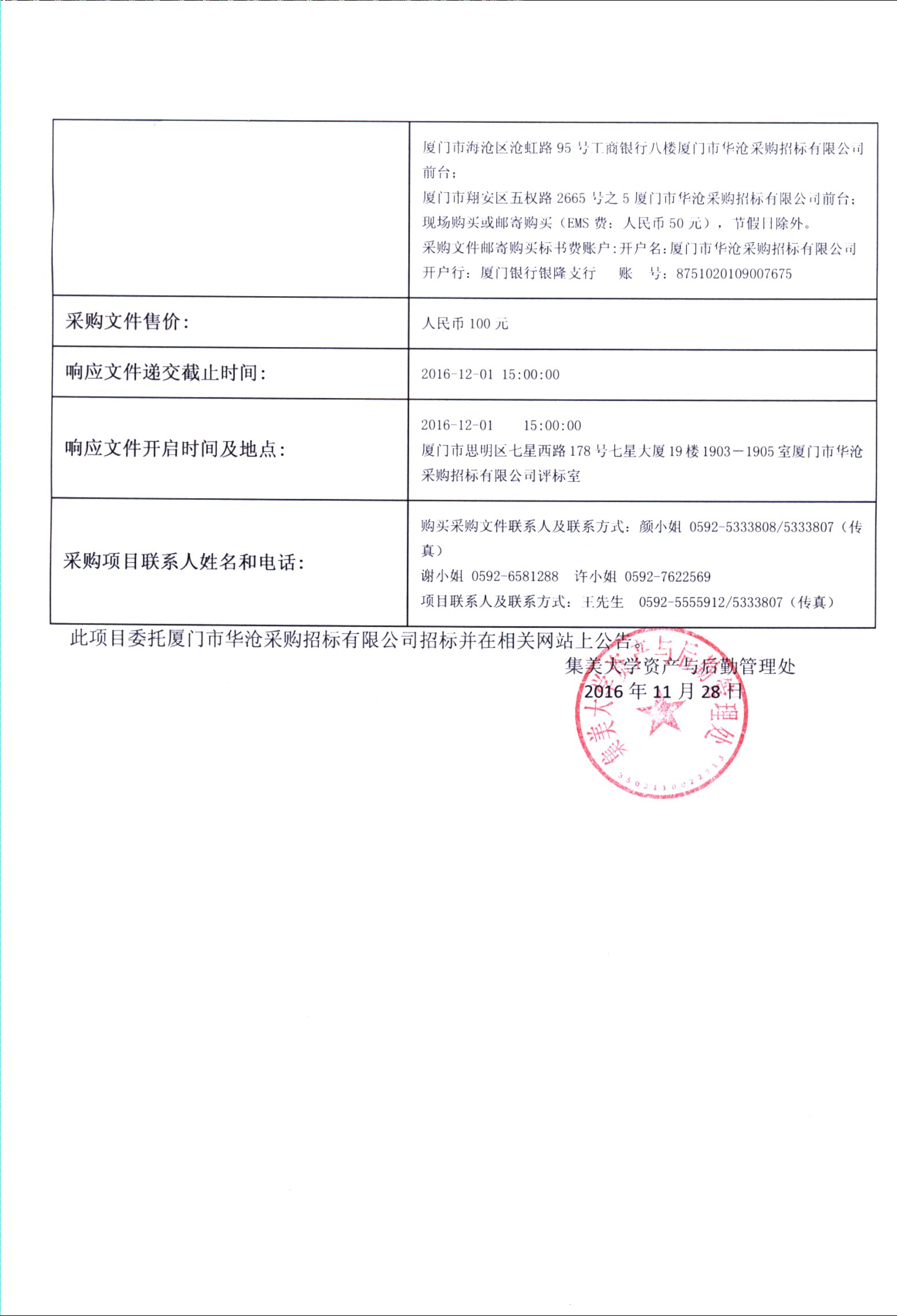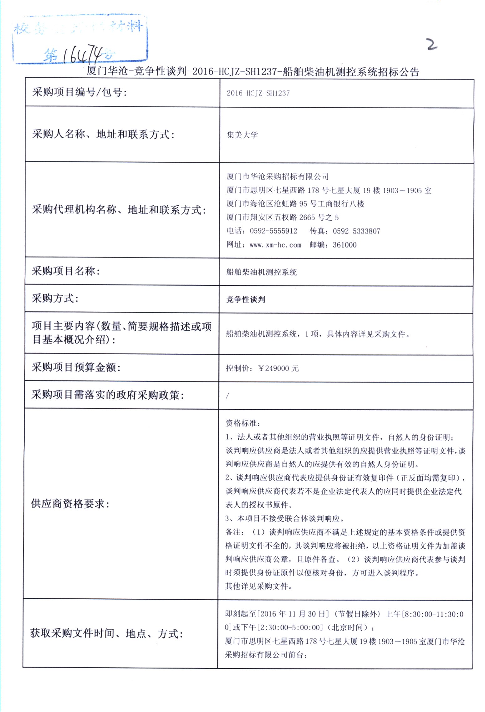厦门华沧-竞争性谈判-2016-HCJZ-SH1237-船舶柴油机测控系统招标公告