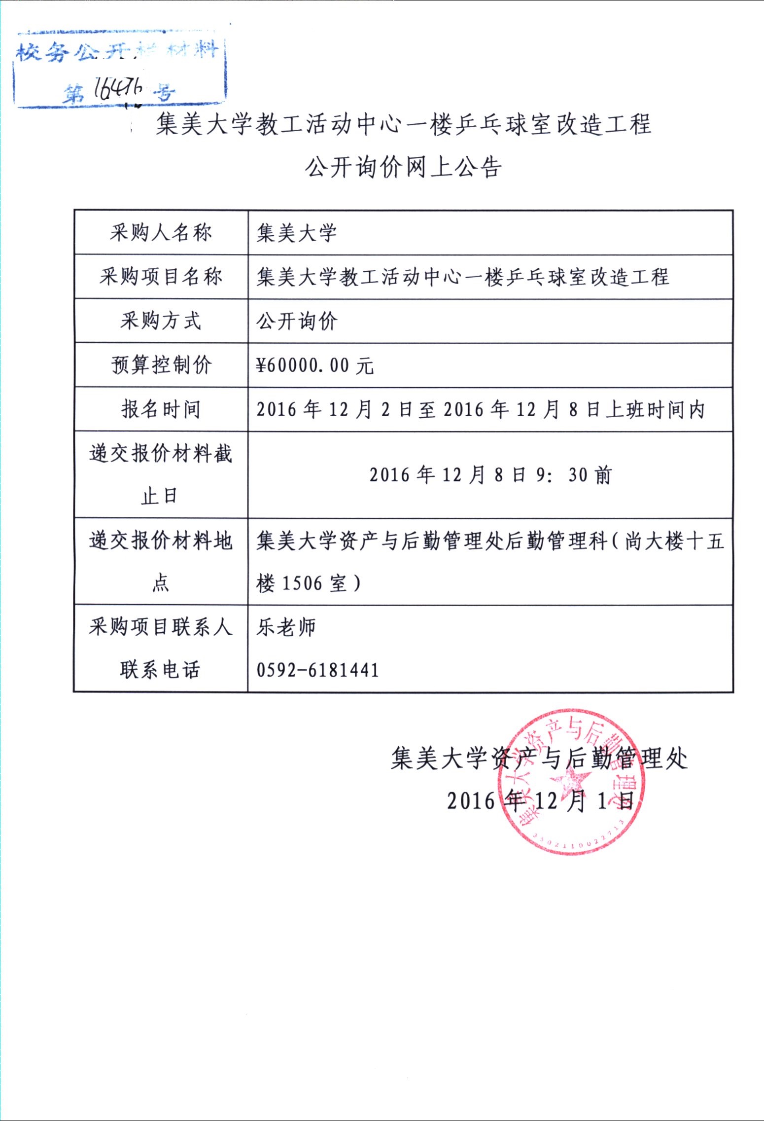 集美大学教工活动中心一楼乒乓球室改造工程公开询价网上公告