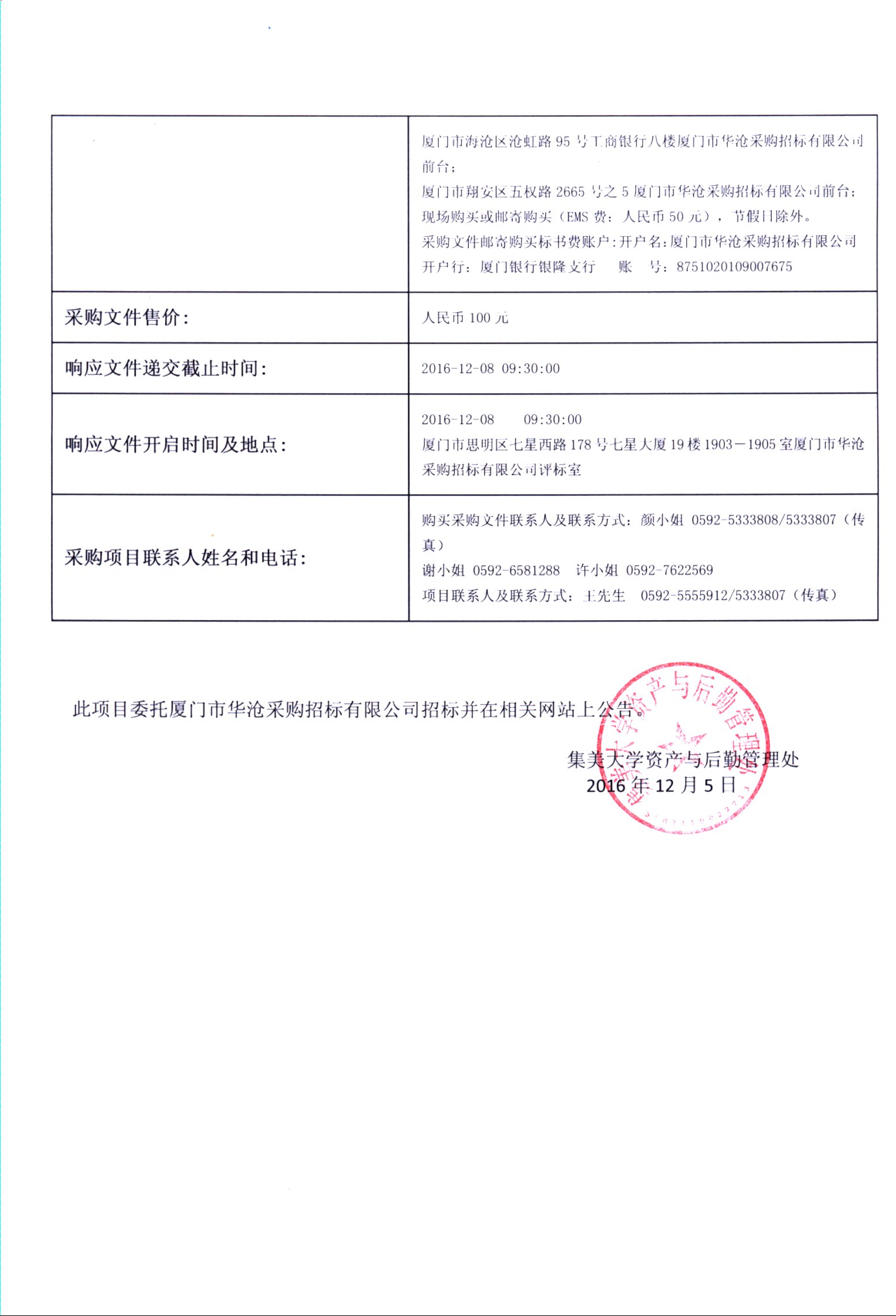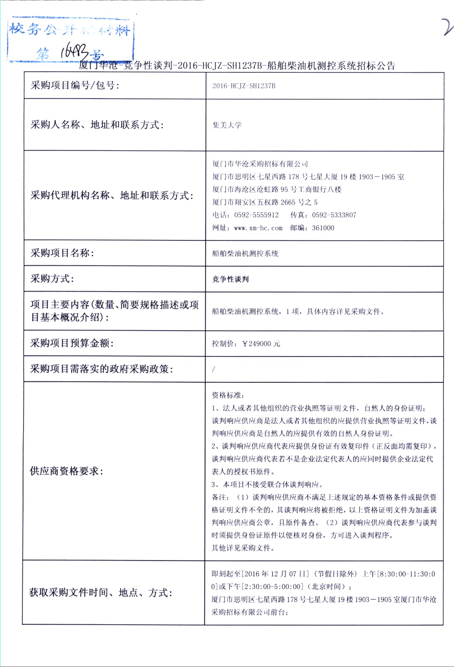 厦门华沧-竞争性谈判-2016-HCJZ-SH1237B-船舶柴油机测控系统招标公告