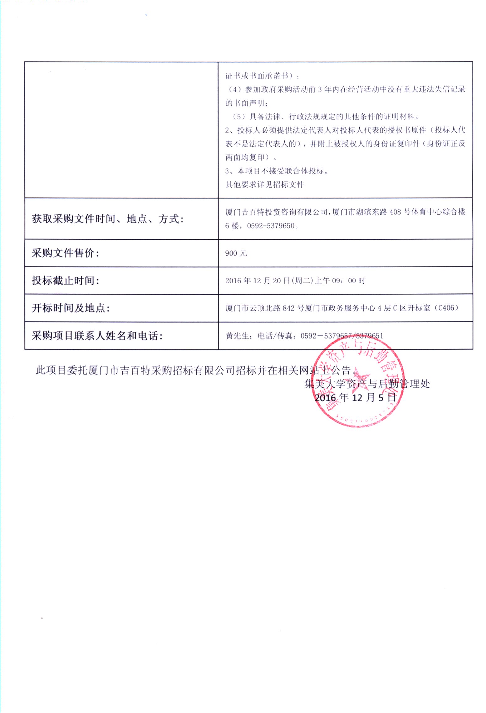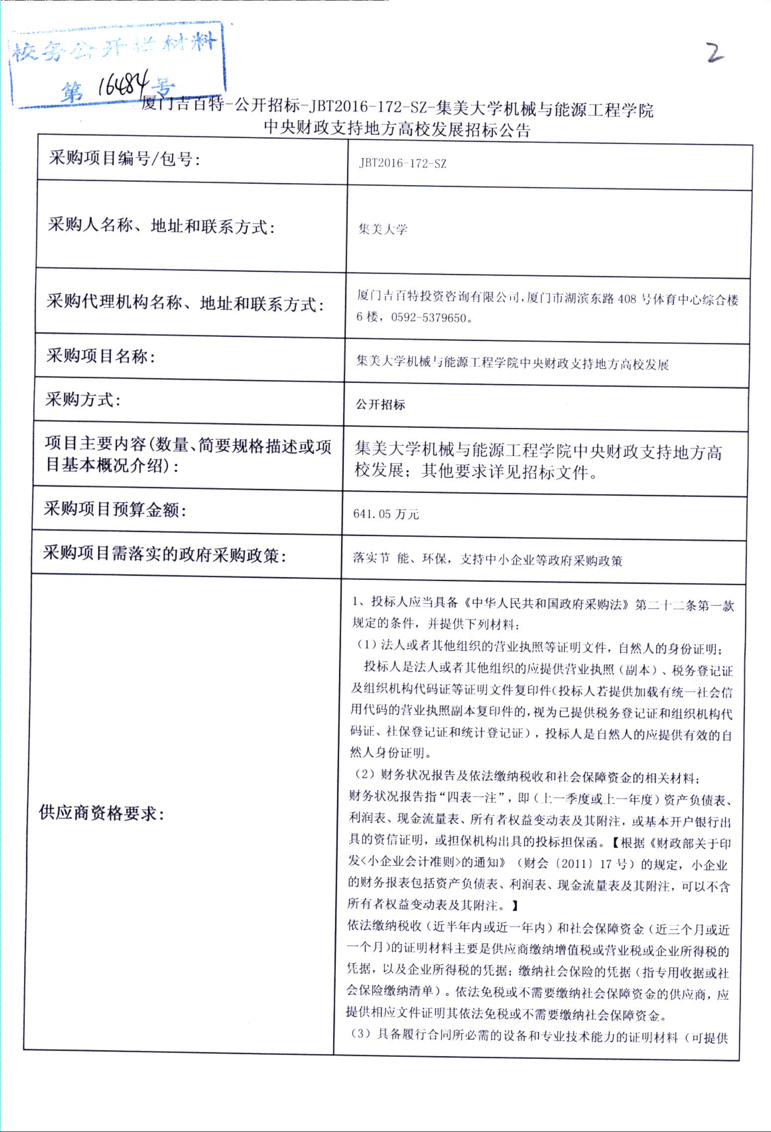 厦门吉百特-公开招标-JBT2016-172-SZ-集美大学机械与能源工程学院中央财政支持地方高校发展招标公告