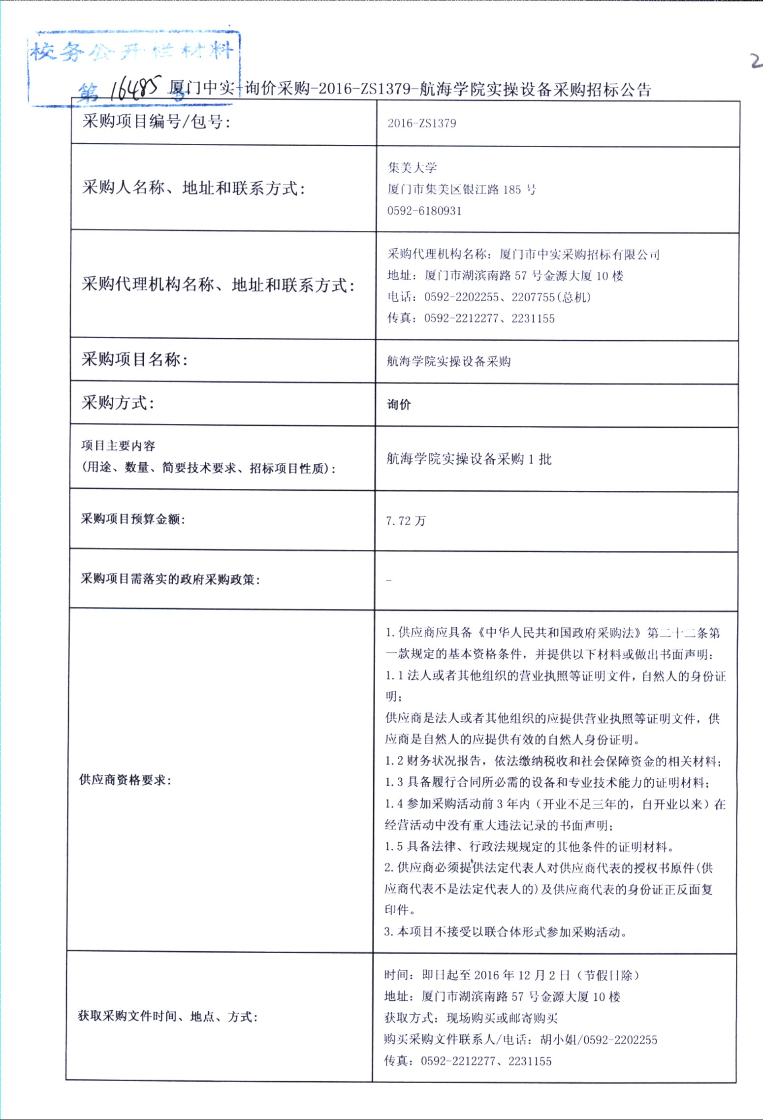 厦门中实-询价采购-2016-ZS1379-航海学院实操设备采购招标公告