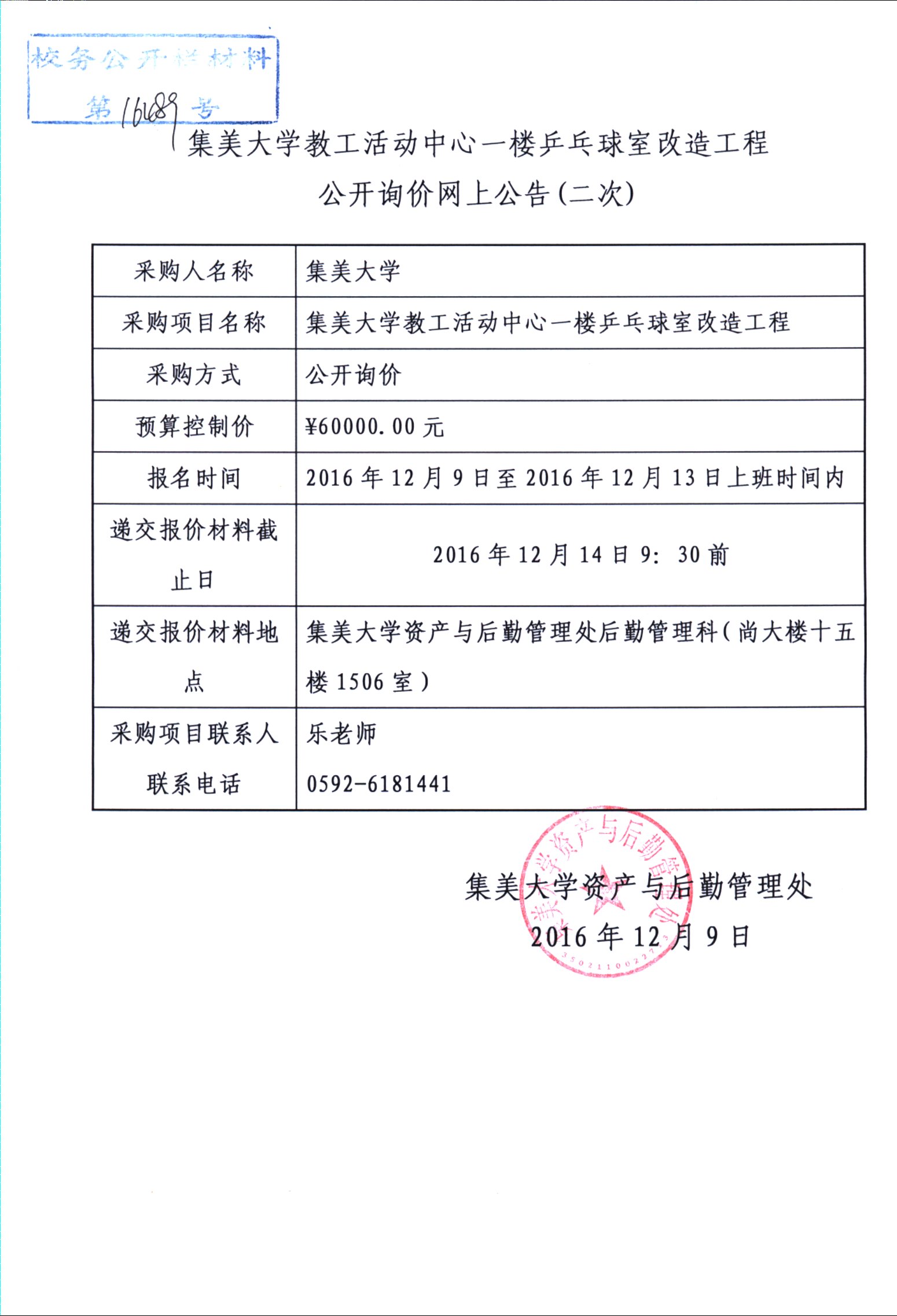 集美大学教工活动中心一楼乒乓球室改造工程公开询价网上公告(二次)