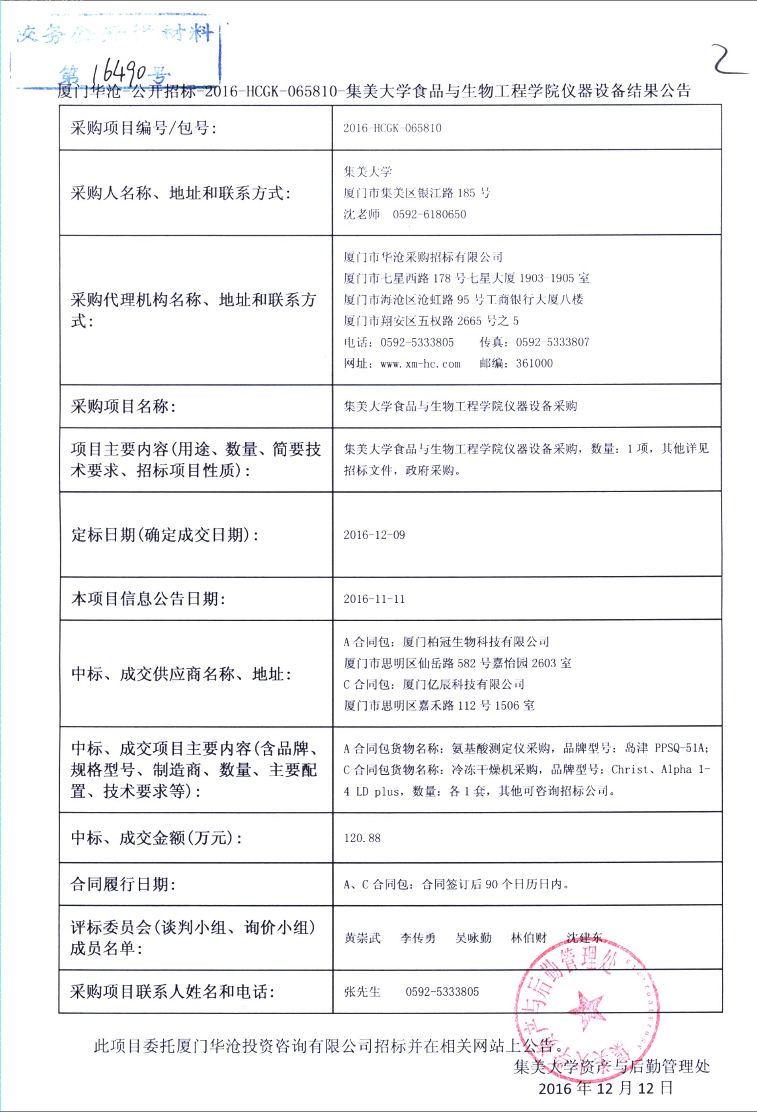 厦门华沧-公开招标-2016-HCGK-065810-集美大学食品与生物工程学院仪器设备结果公告