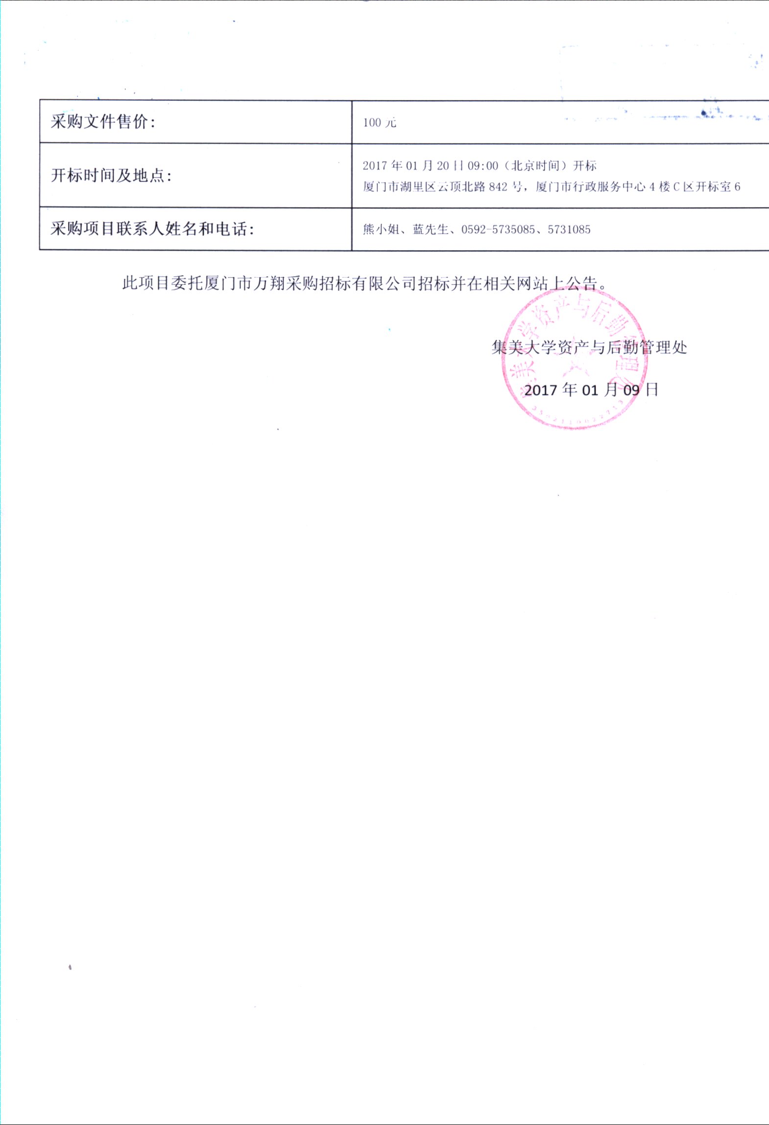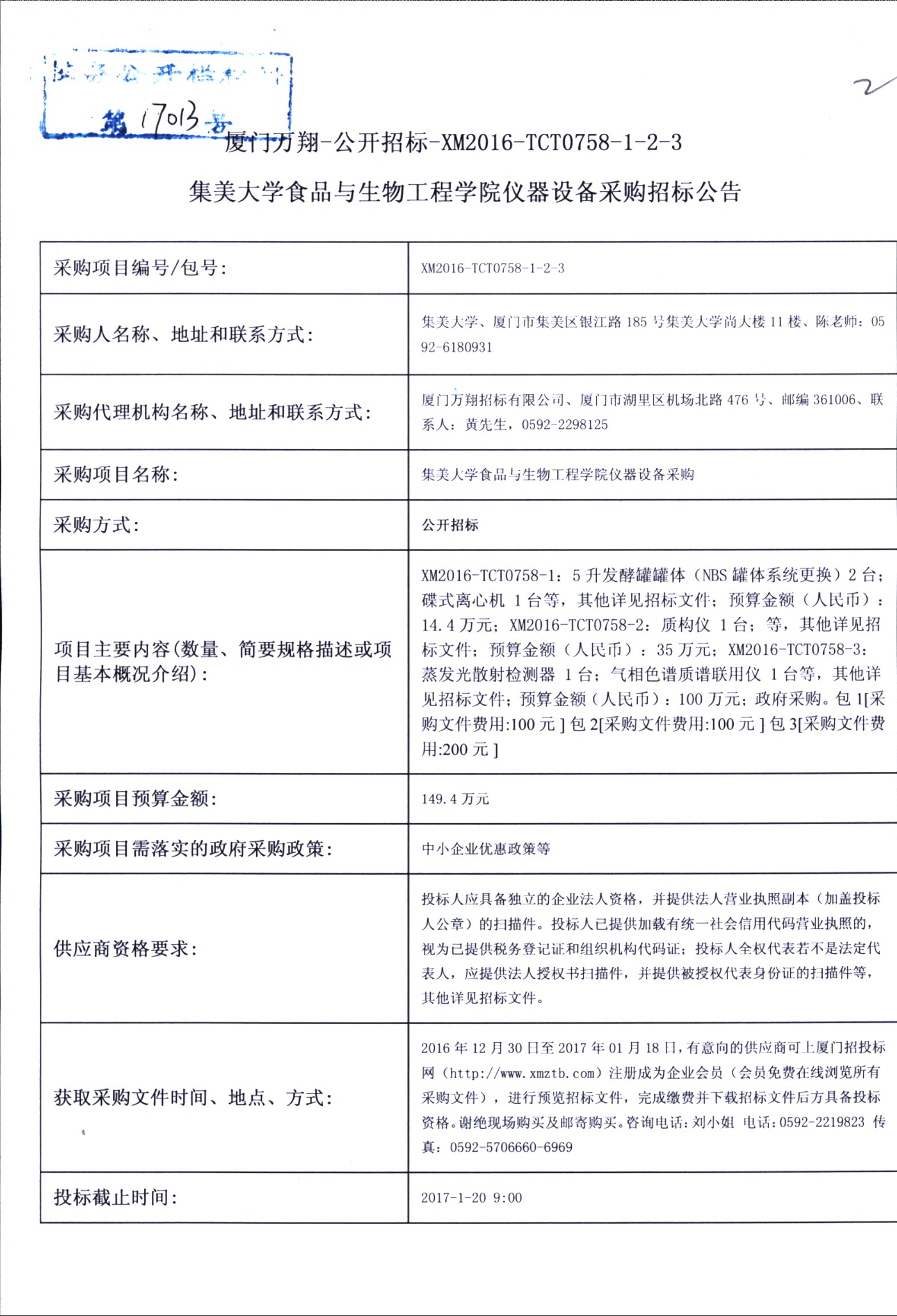 厦门万翔-公开招标-XM2016-TCT0758-1-2-3集美大学食品与生物工程学院仪器设备采购招标公告
