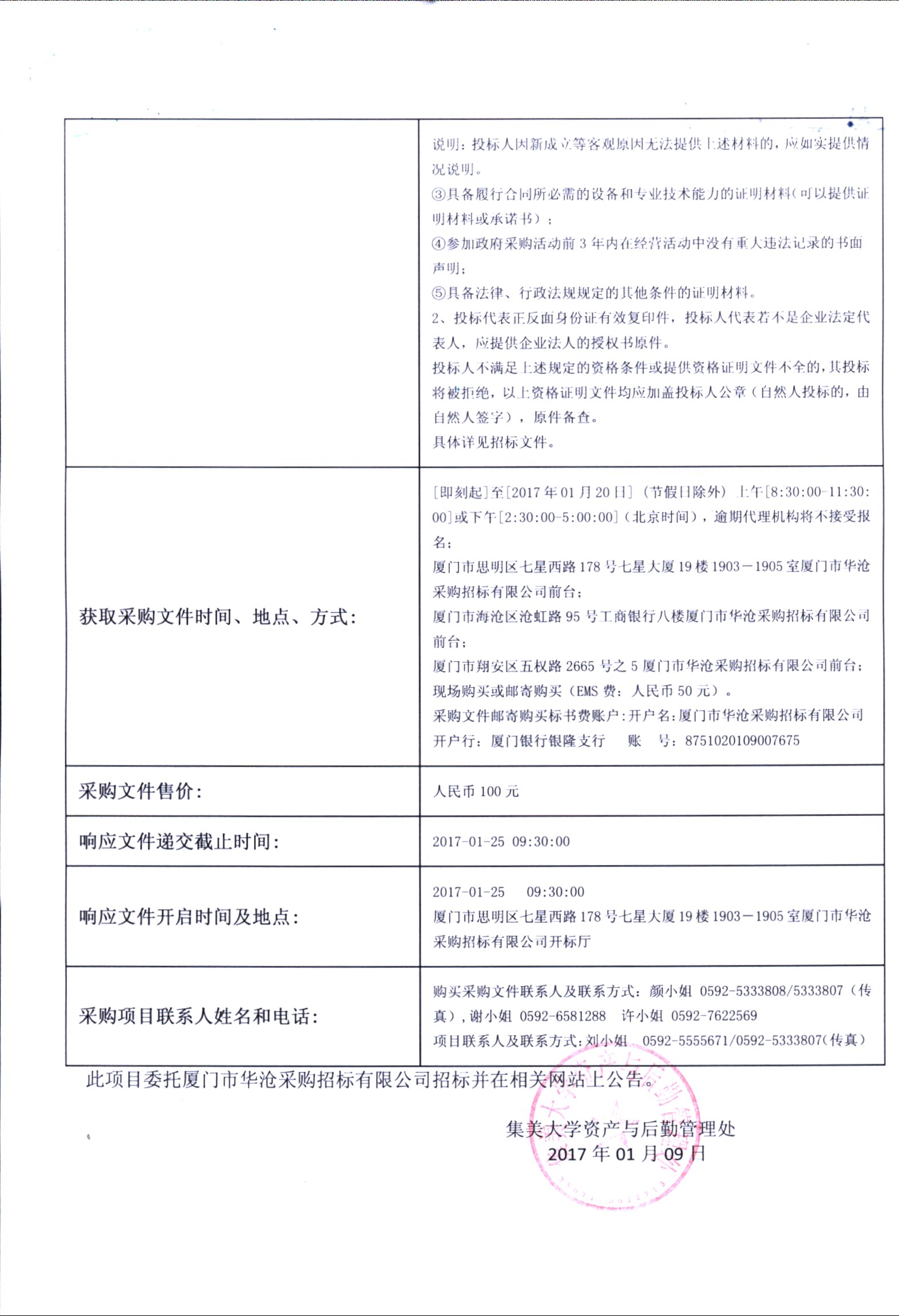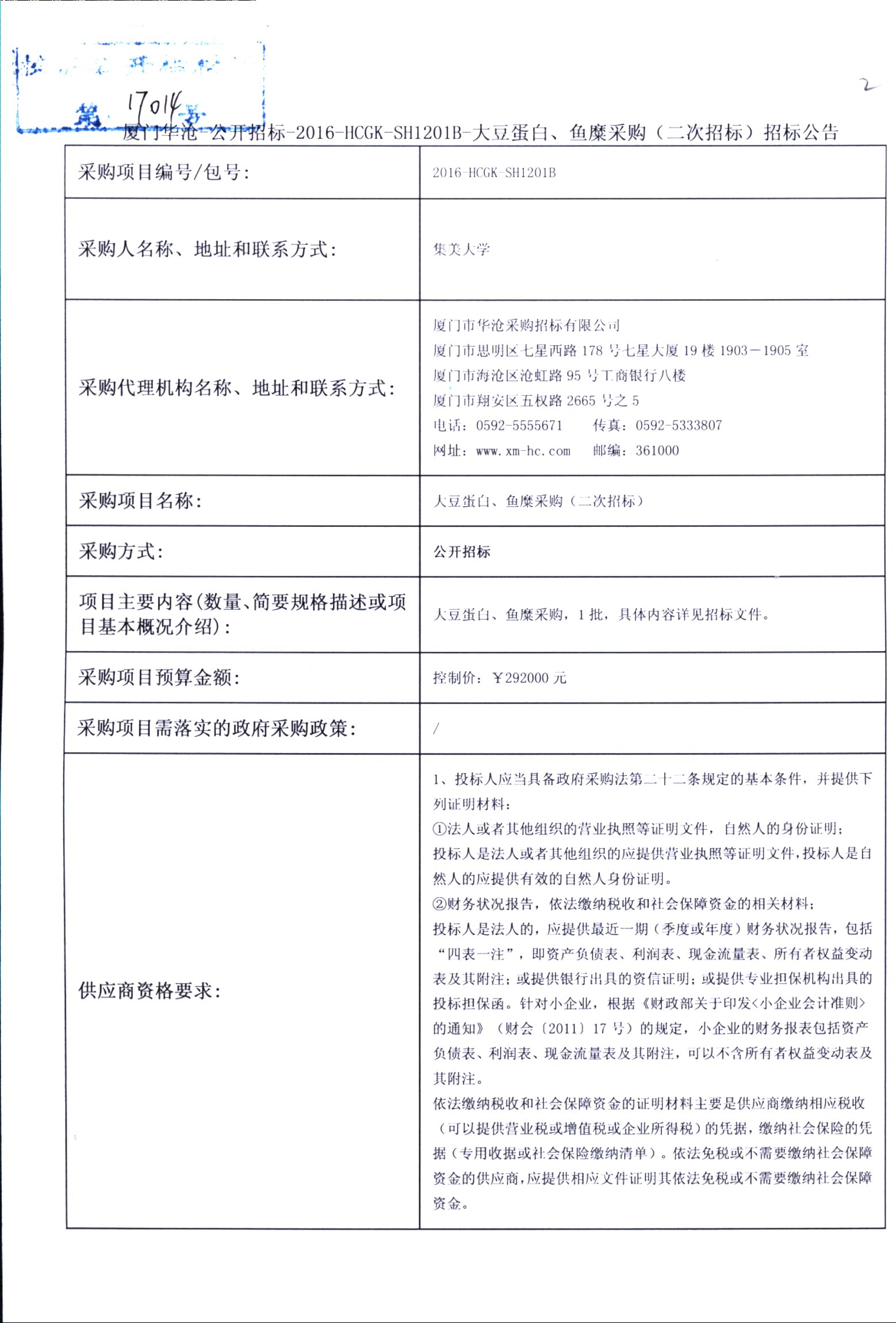 厦门华沧-公开招标-2016-HCGK-SH1201B-大豆蛋白、鱼糜采购(二次招标)招标公告