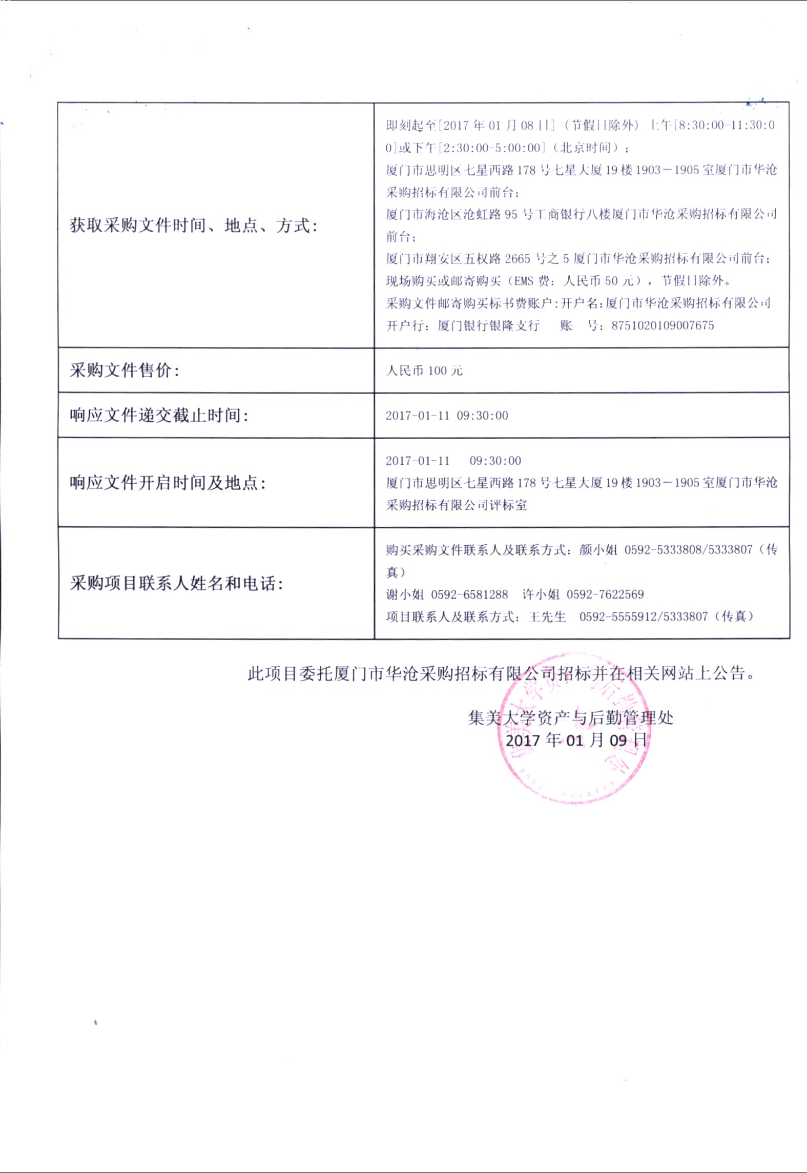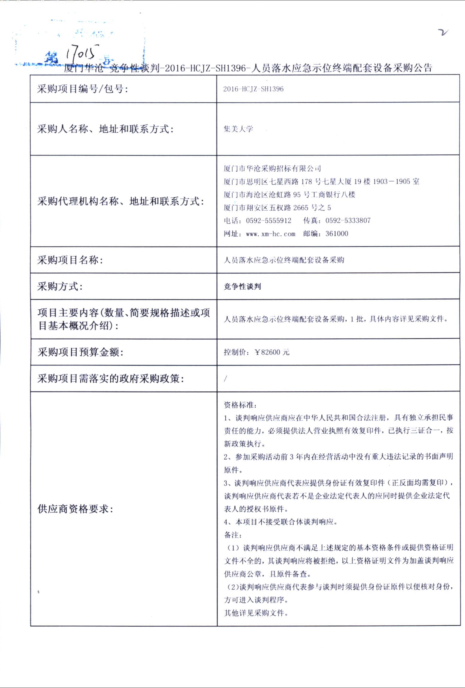 厦门华沧-竞争性谈判-2016-HCJZ-SH1396-人员落水应急示位终端配套设备采购公告