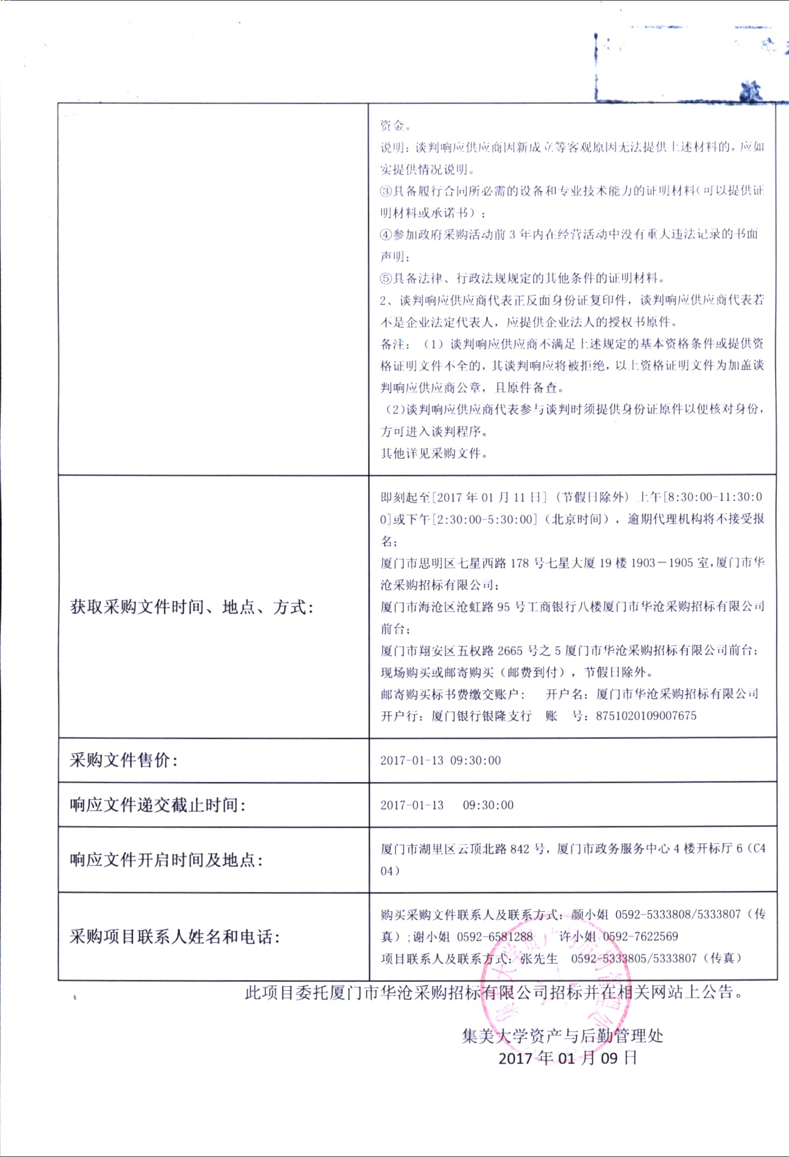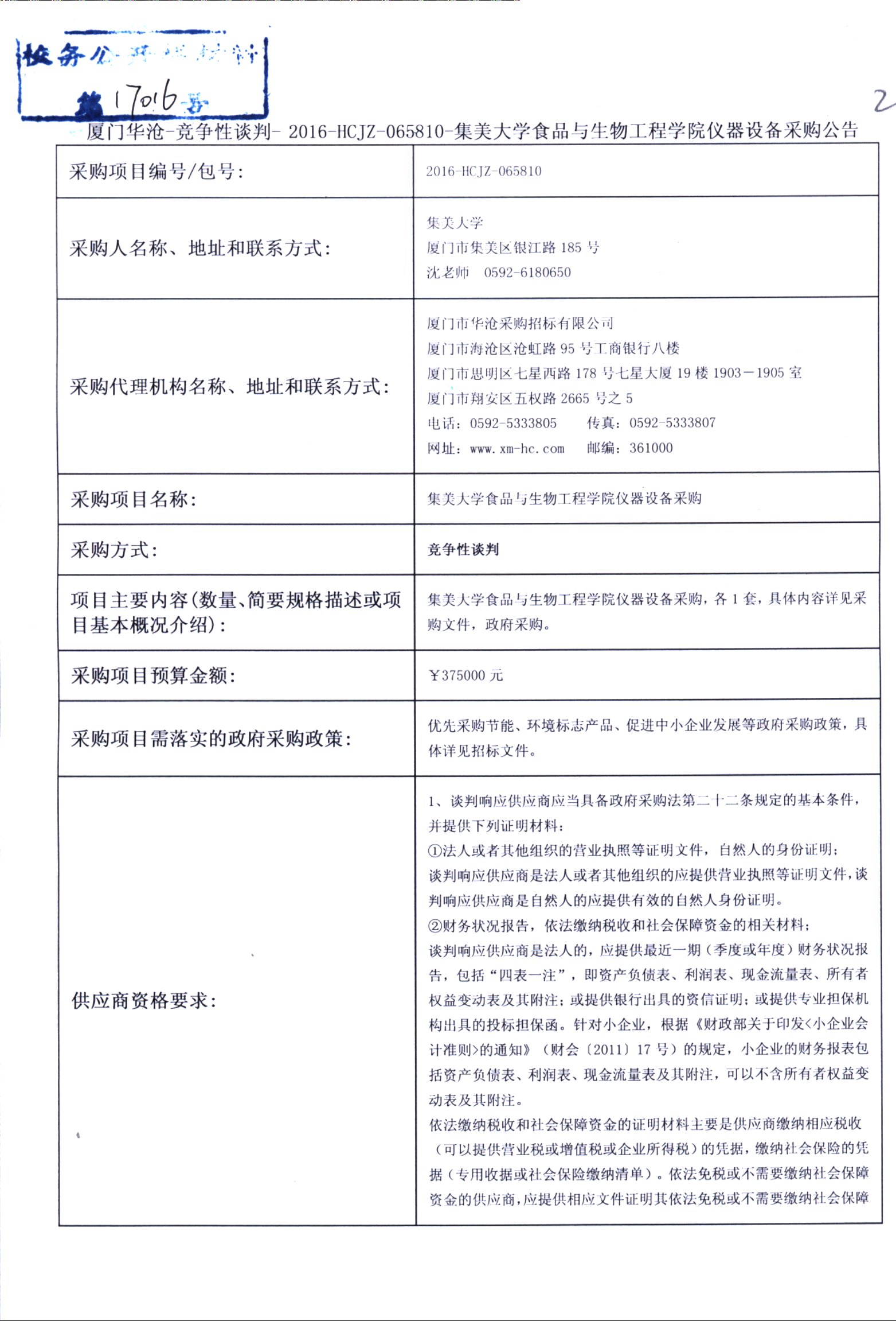 厦门华沧-竞争性谈判-2016-HCJZ-065810-集美大学食品与生物工程学院仪器设备采购公告