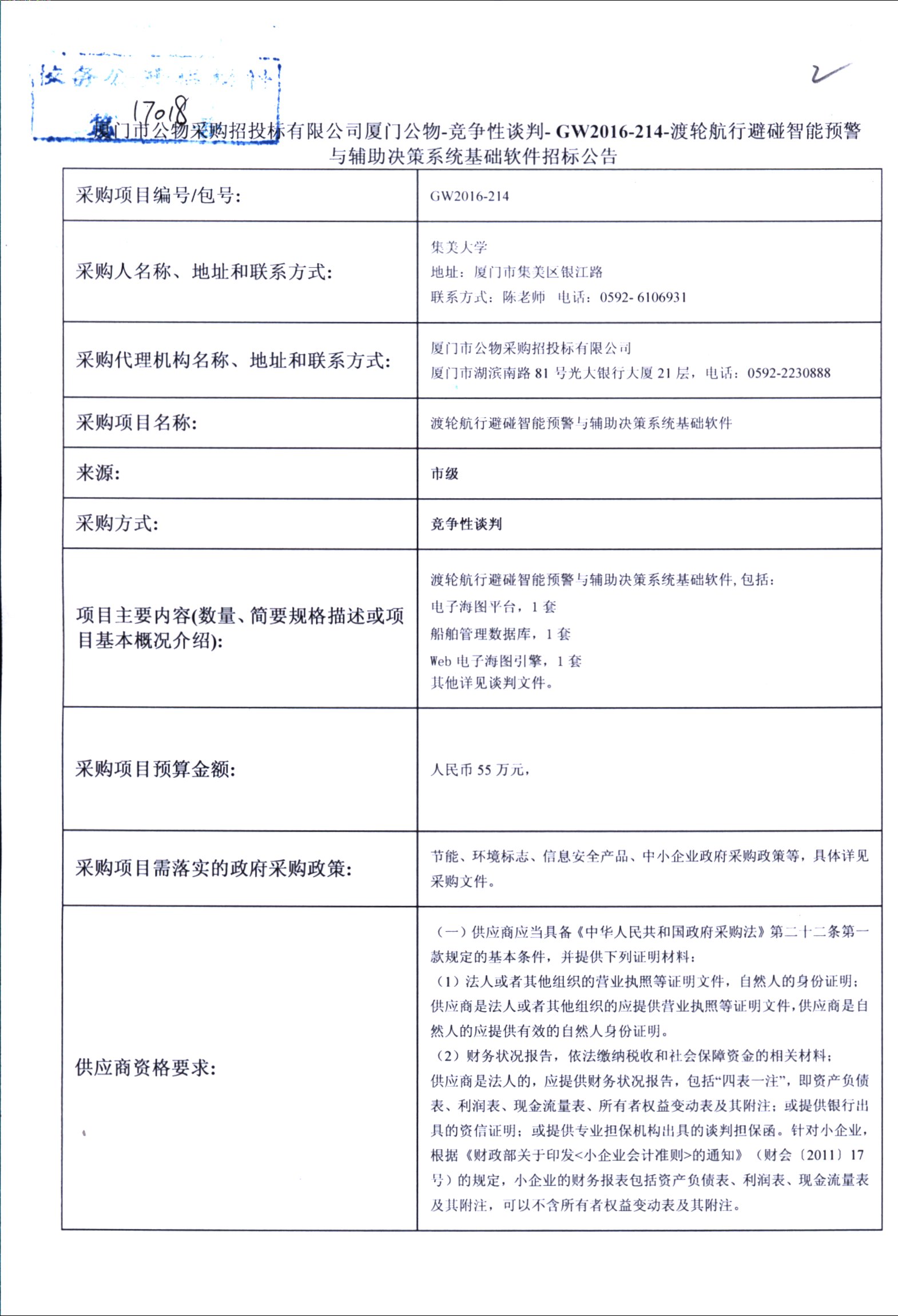 厦门市公物采购招投标有限公司厦门公物-竞争性谈判-GW2016-214-渡轮航行避碰智能预警与辅助决策系统基础软件招标公告
