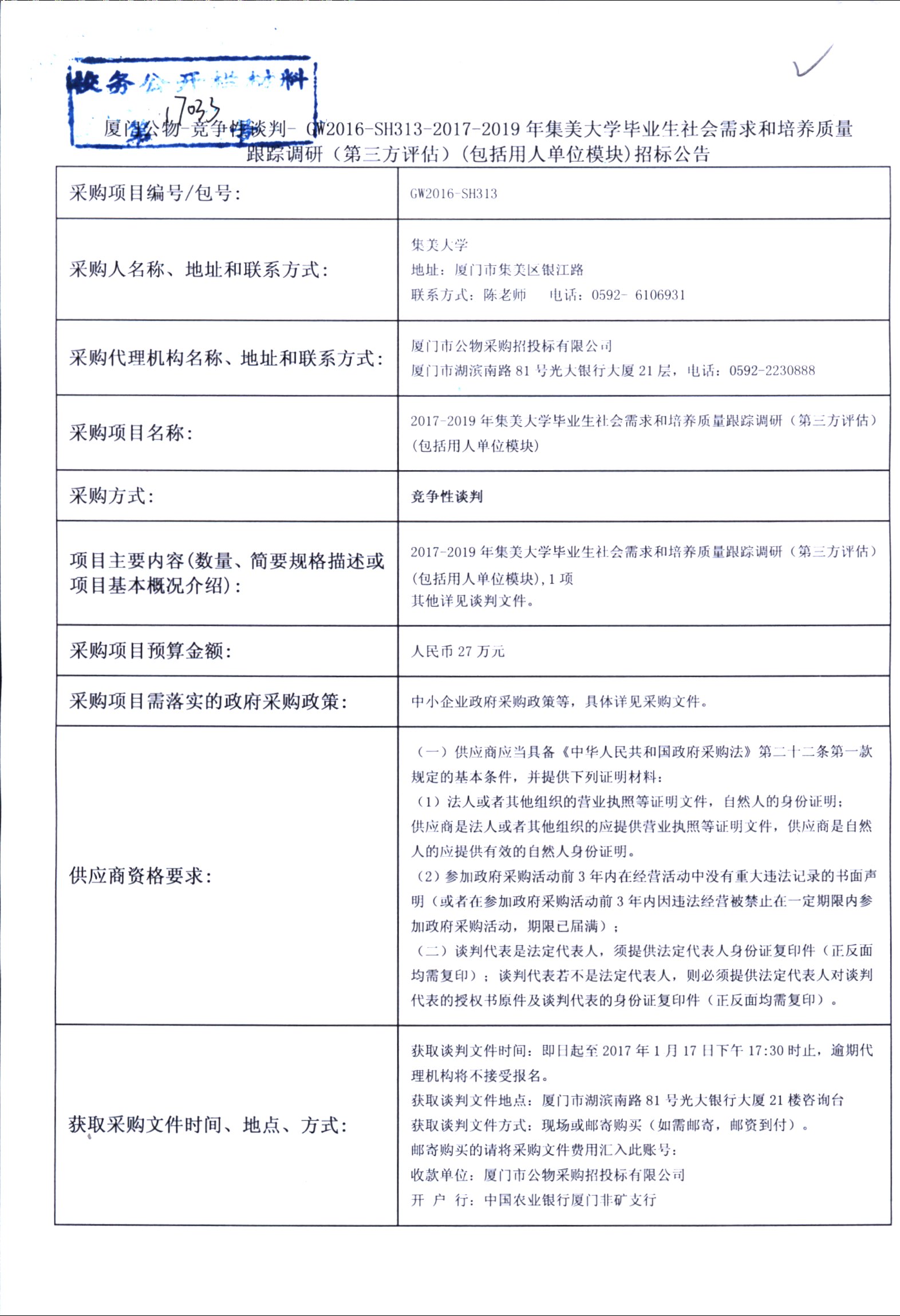 厦门公物-竞争性谈判-GW2016-SH313-2017-2019年集美大学毕业生社会需求和培养质量跟踪调研(第三方评估)(包括用人单位模块)招标公告
