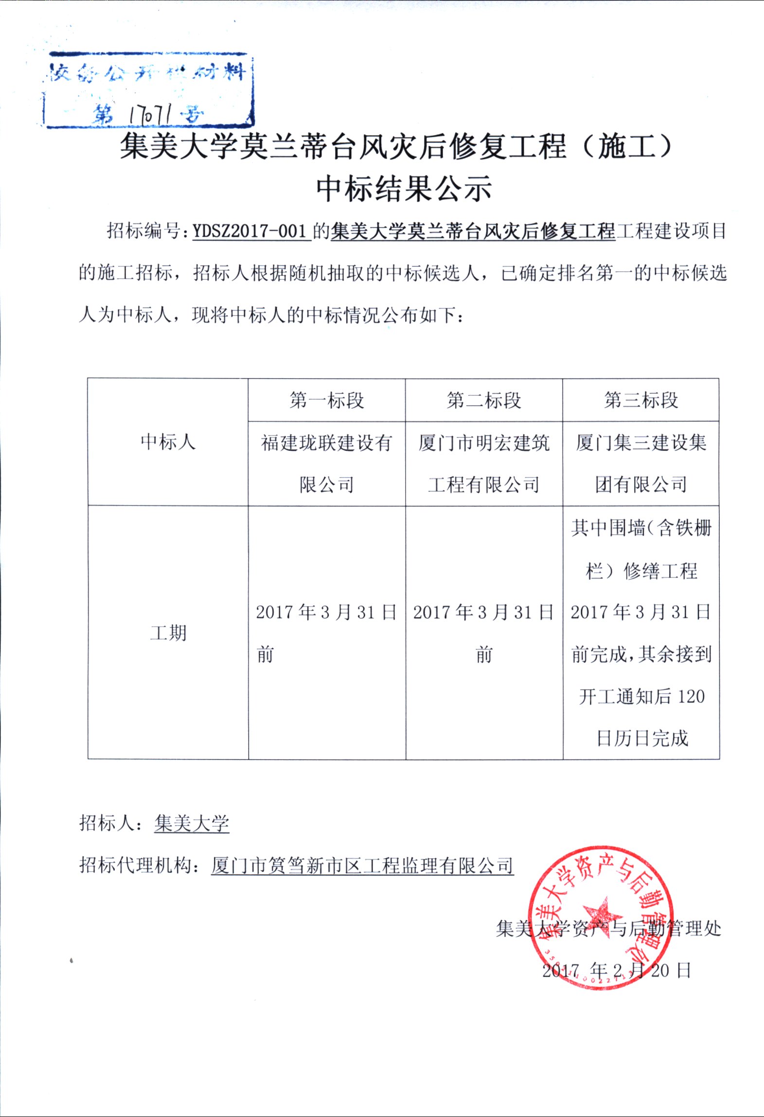 集美大学莫兰蒂台风灾后修复工程(施工)中标结果公告