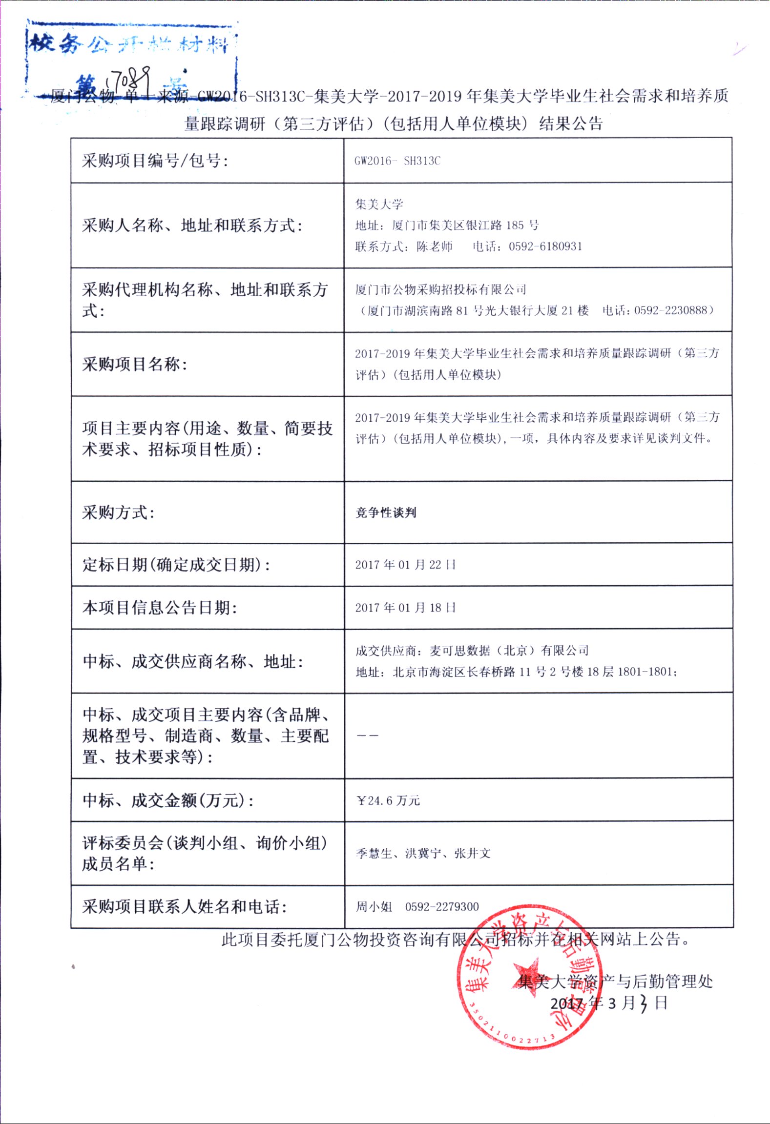 厦门公物-单一来源-GW2016-SH313C-集美大学-2017-2019年集美大学毕业生社会需求和培养质量跟踪调研(第三方评估)(包括用人单位模块)结果公示