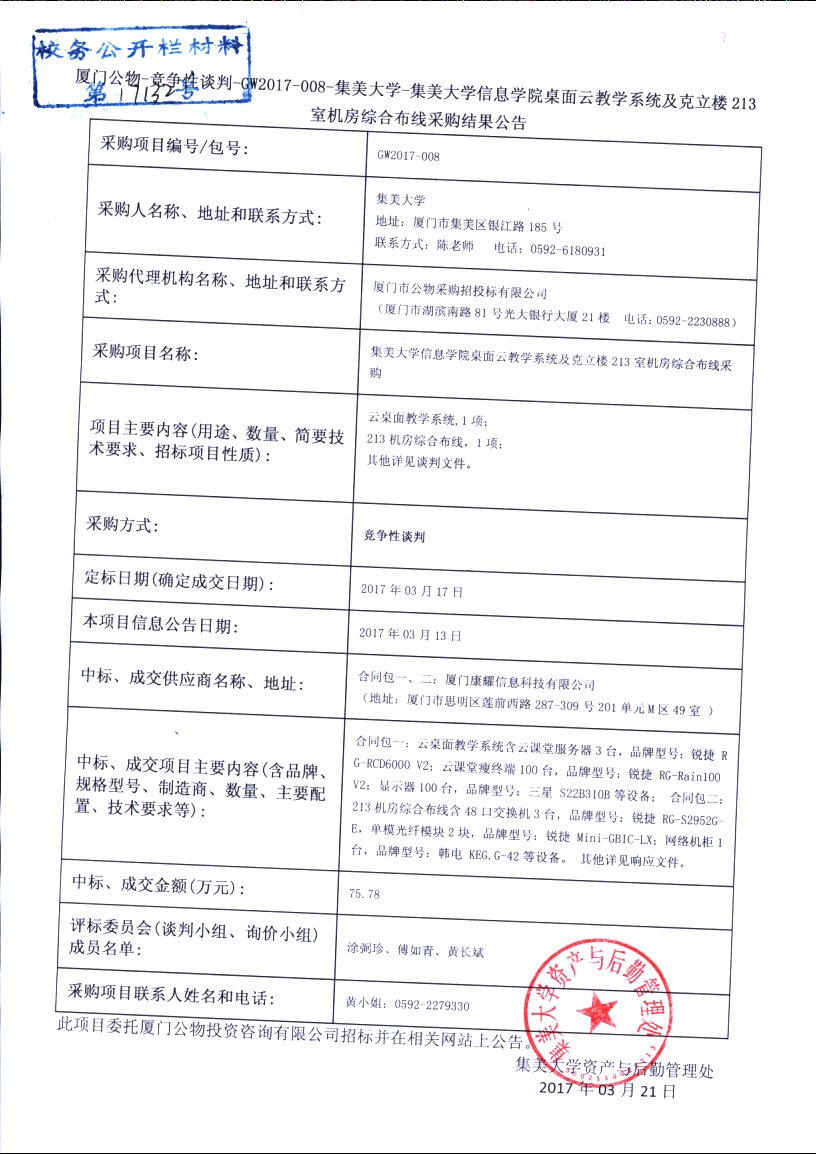 厦门公物-竞争性谈判-GW2017-008-集美大学-集美大学信息学院桌面云教学系统及克立楼213室机房综合布线采购结果公告