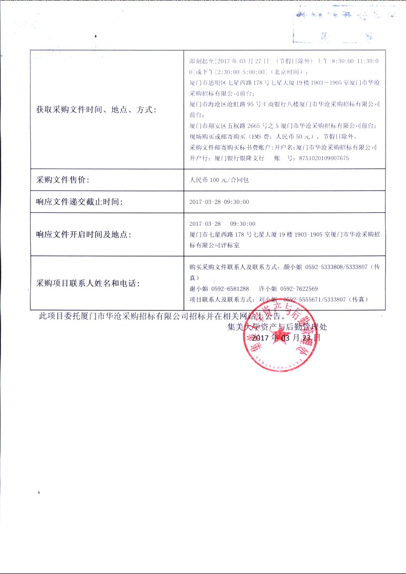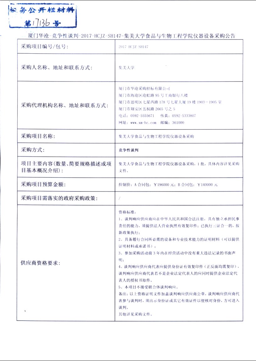 厦门华沧-竞争性谈判-2017-HCJZ-SH147-集美大学食品与生物工程学院仪器设备采购公告