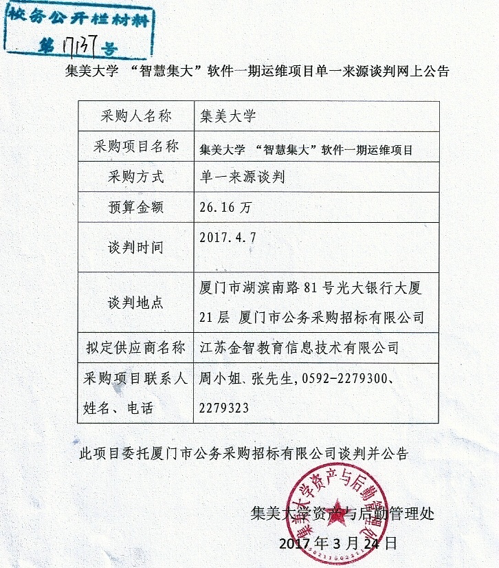 集美大学“智慧集大”软件一期运维项目单一来源谈判网上公告
