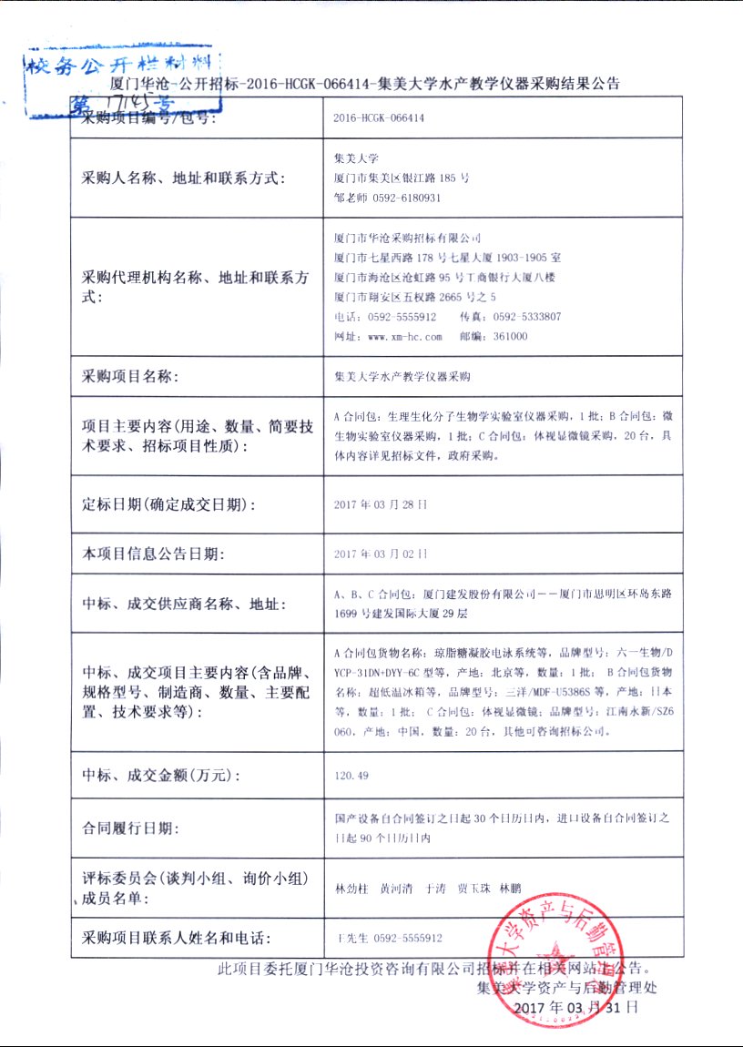 厦门华沧-公开招标-2016-HCGK-066414-集美大学水产教学仪器采购结果公告