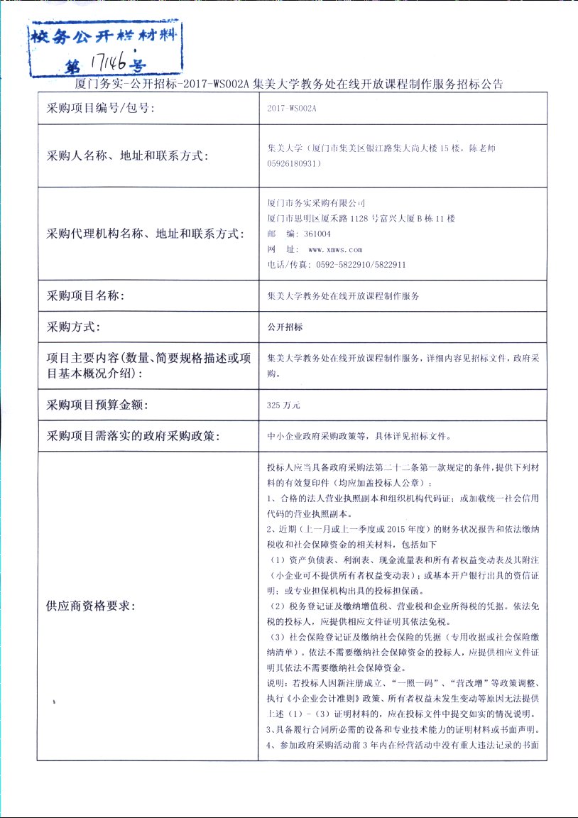 厦门务实-公开招标-2017-WS002A集美大学教务处在线开放课程制作服务招标公告