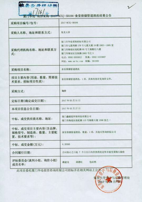 厦门华沧—询价采购—2017—HCXJ-SH184-食堂排烟管道清洗结果公告
