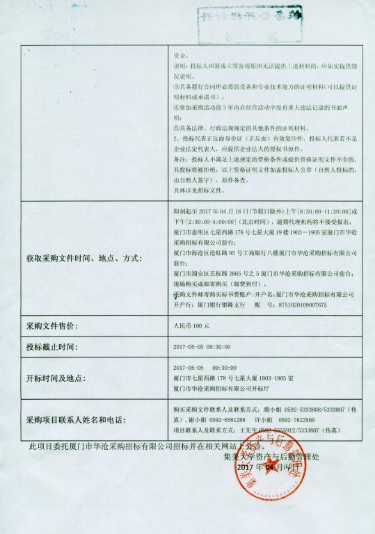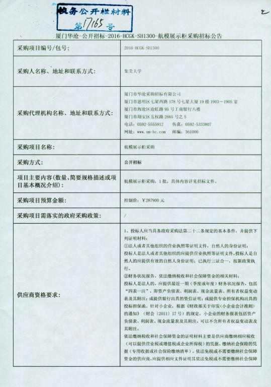 厦门华沧—公开招标—2016—HCGK-SH1300-航模展示柜采购招标公告