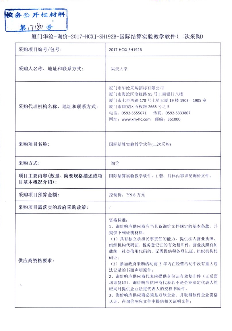 厦门华沧-询价-2017-HCXJ-SH192B-国际结算实验教学软件(二次采购)