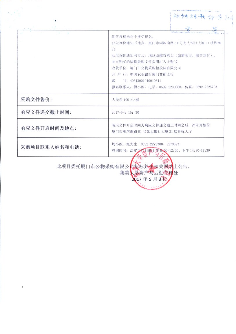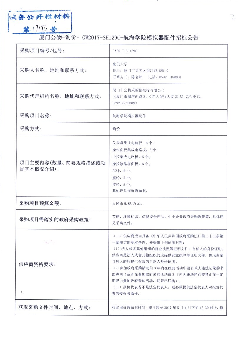 厦门公物-询价-GW2017-SH129C-航海学院模拟器配件招标公告