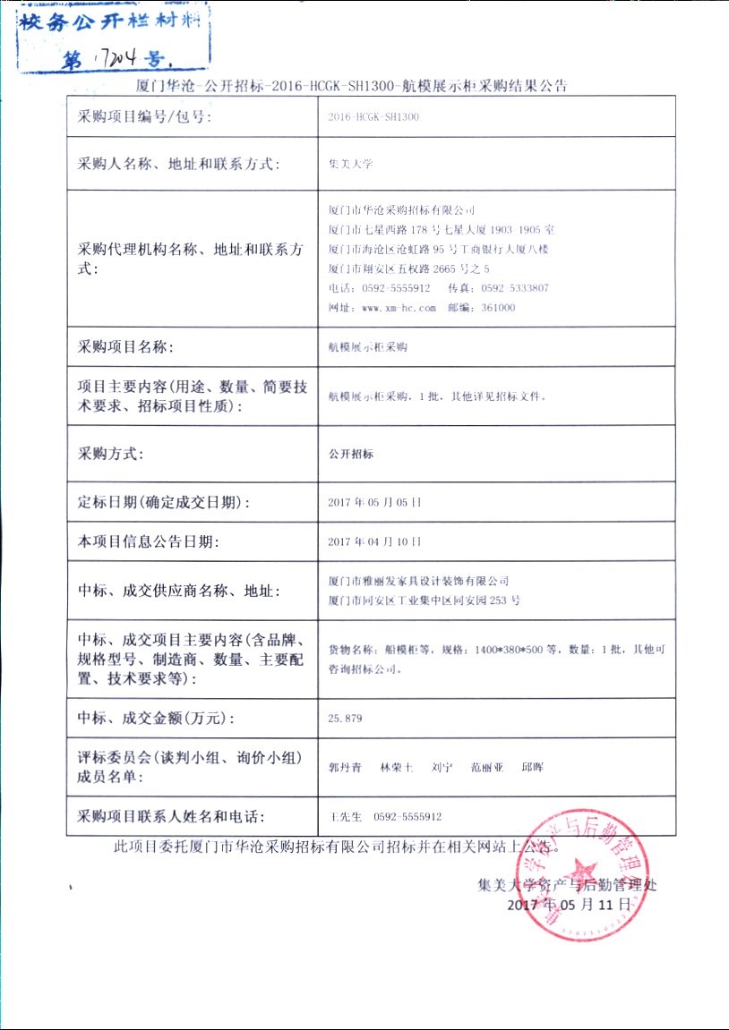 厦门华沧-公开招标-2016-HCGK-SH1300-航海展示柜采购结果公告