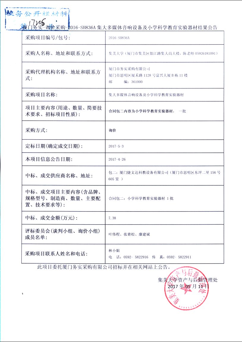 厦门务实-询价采购-2016-SH836A集大多媒体音响设备及小学科学教育实验器材结果公告