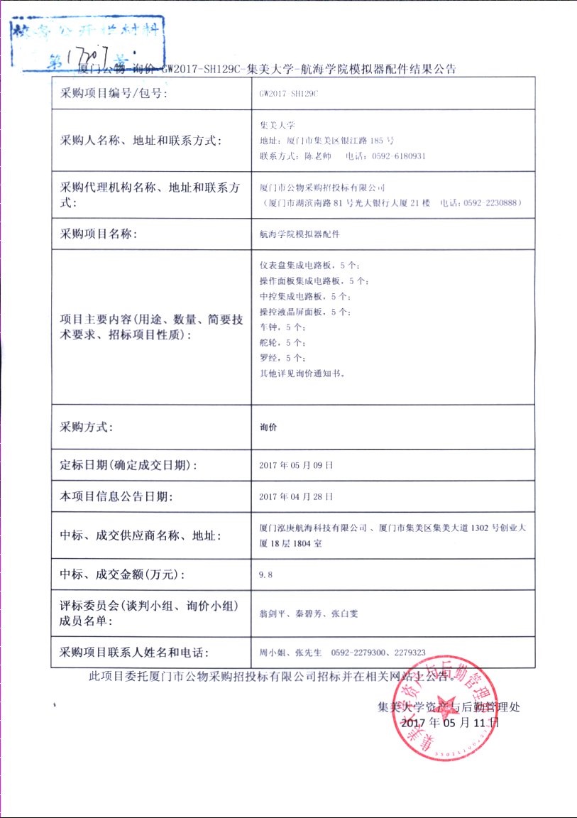 厦门公物-询价-GW2017-SH129C-集美大学-航海学院模拟器配件结果公告