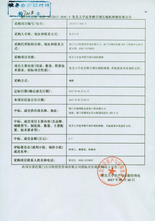 厦门吉百特—询价—JBT2017-264C-Z-集美大学延奎楼空调压缩机维修结果公告