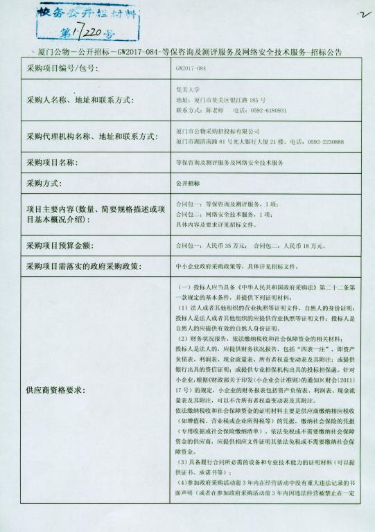 厦门公物—公开招标—GW2017-084-等保咨询及测评服务及网络安全技术服务—招标公告