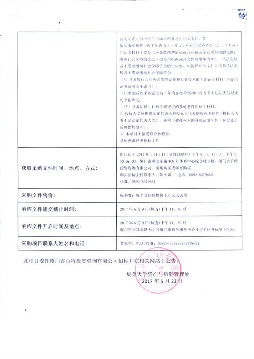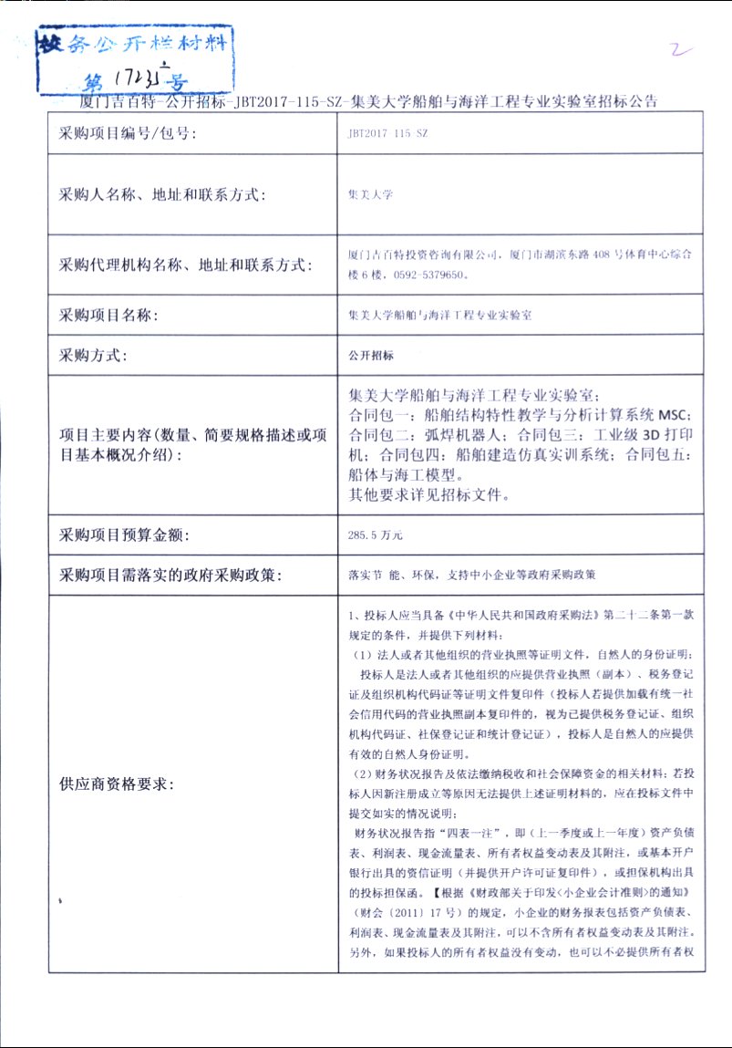 厦门吉百特-公开招标-JBT2017-115-SZ-集美大学船舶与海洋工程专业实验室招标公告