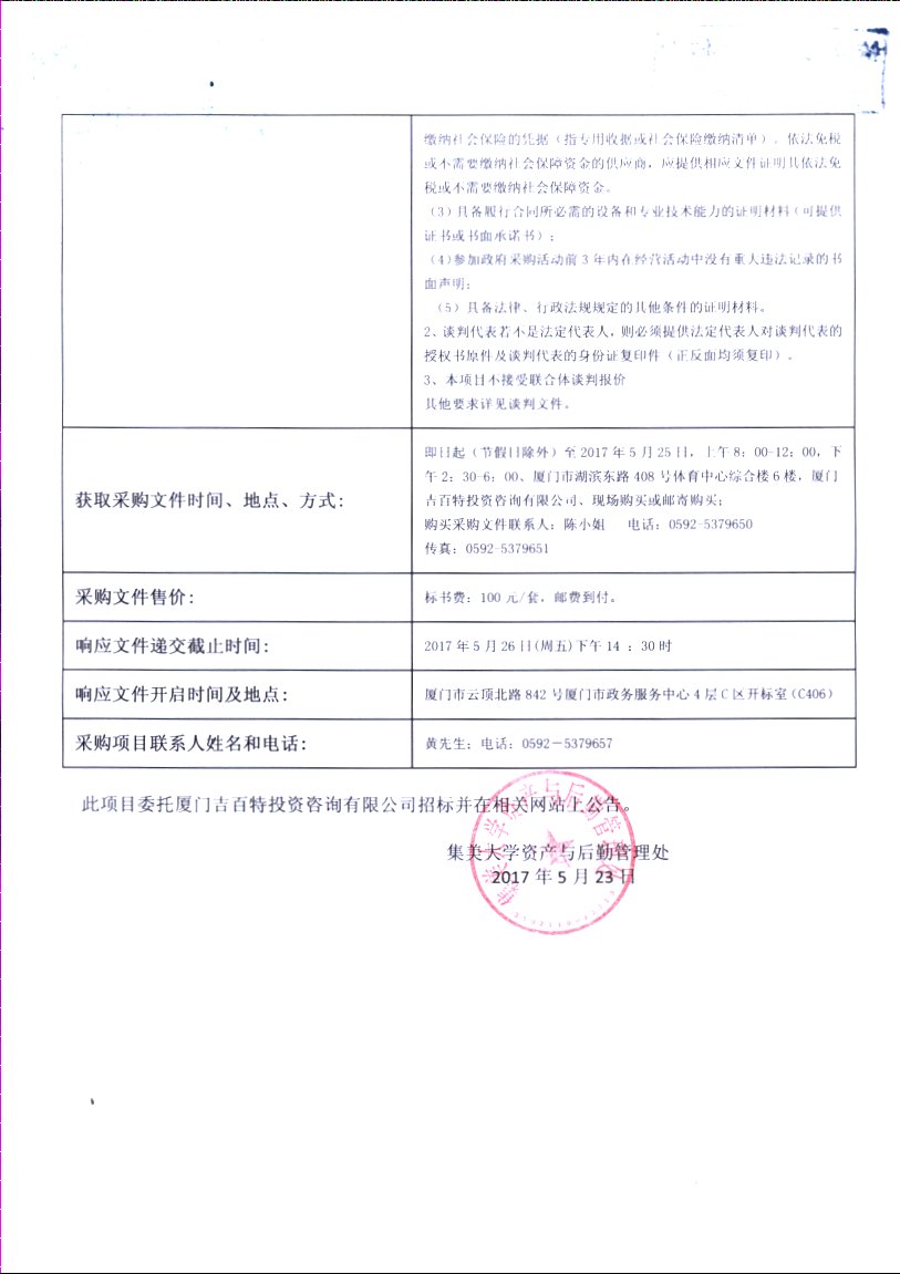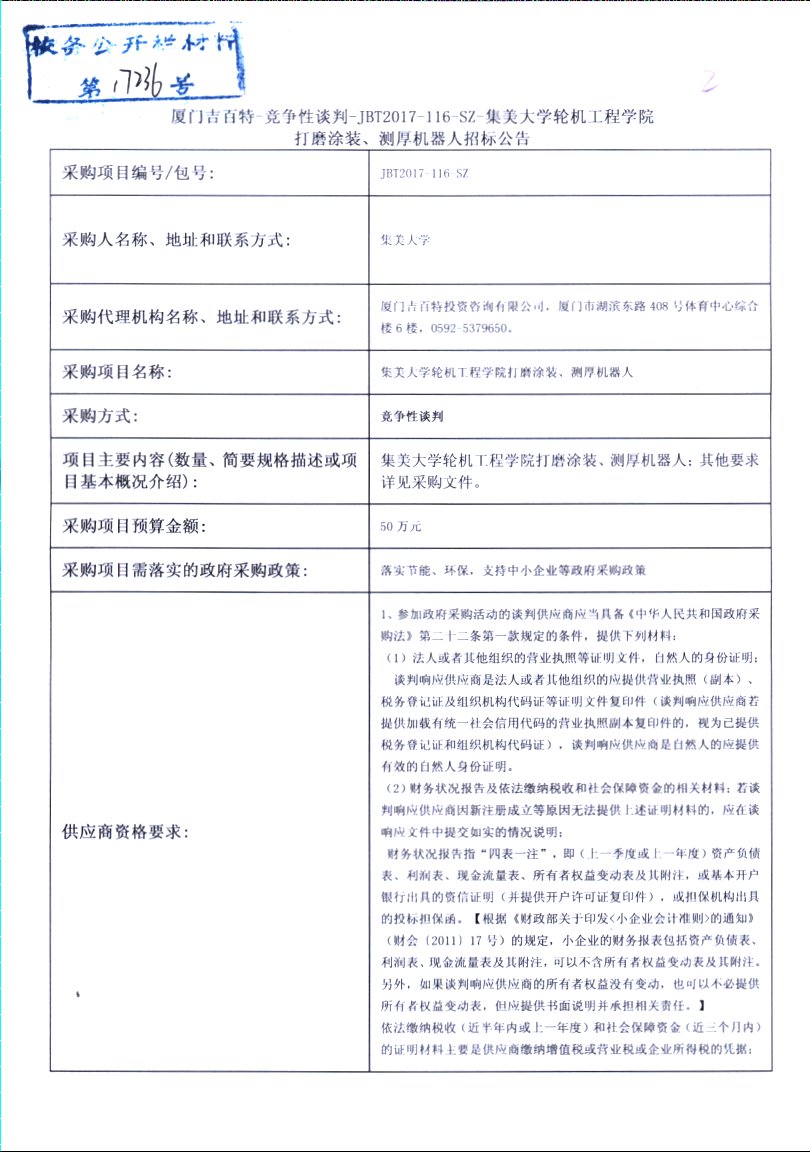 厦门吉百特-竞争性谈判-JBT2017-116-SZ-集美大学轮机工程学院打磨涂装、测厚机器人招标公告