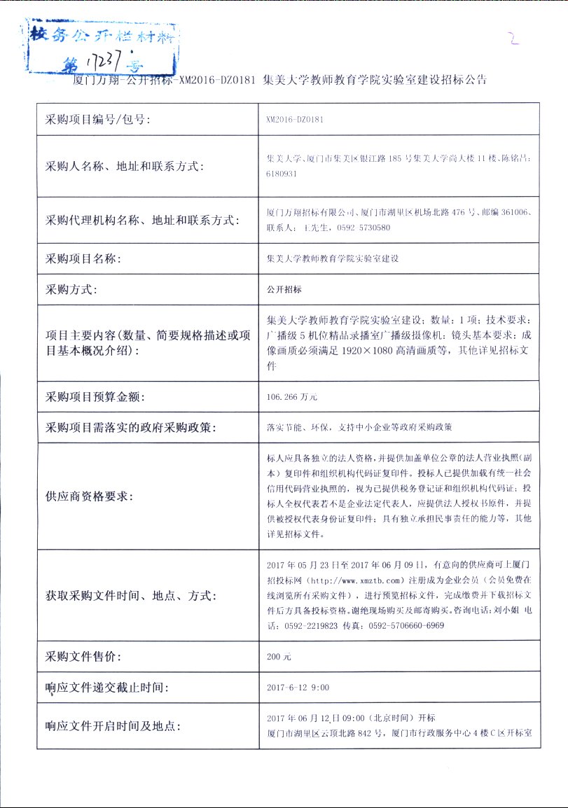 厦门万翔-公开招标-XM2016-DZ0181集美大学教师教育学院实验室建设招标公告