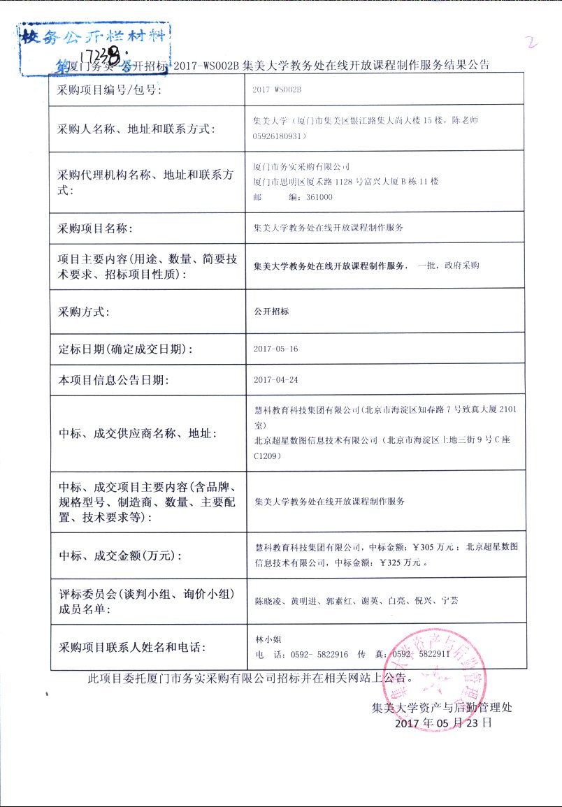 厦门务实-公开招标-2017-WS002B集美大学教务处在线开放课程制作服务结果公告