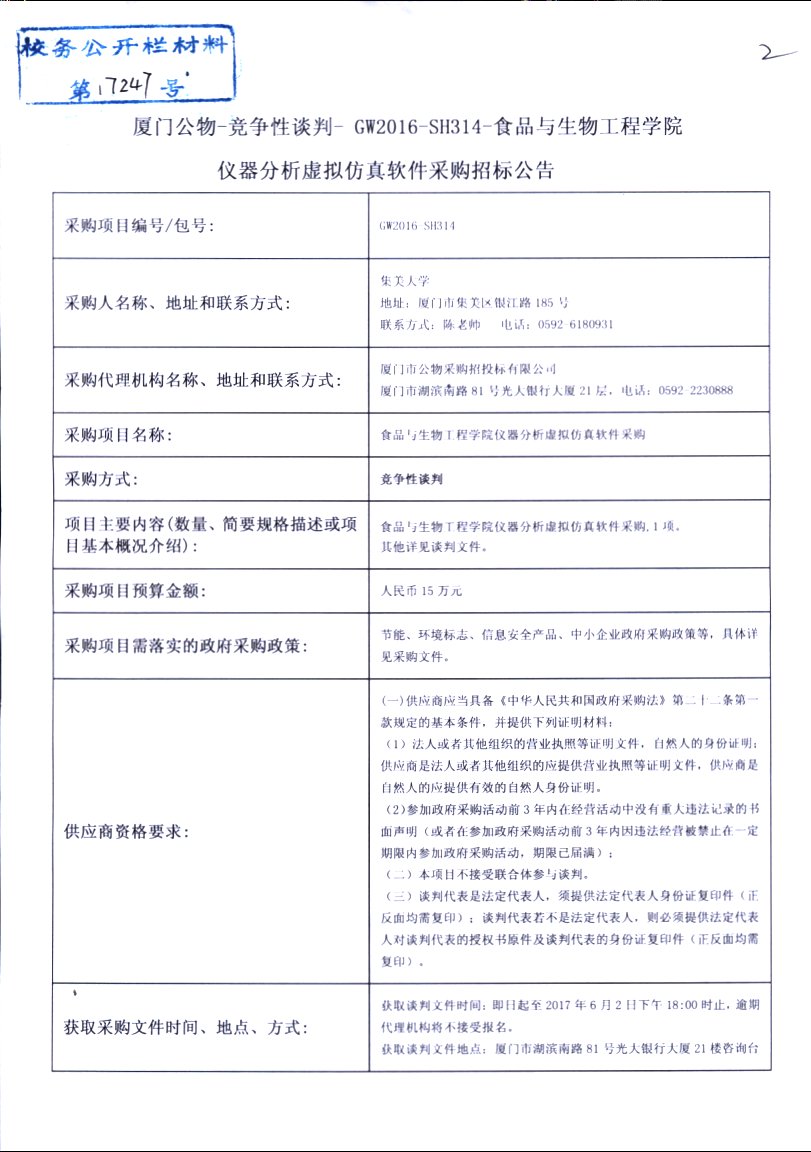 厦门公物-竞争性谈判-GW2016-SH314-食品与生物工程学院仪器分析虚拟仿真软件采购招标公告