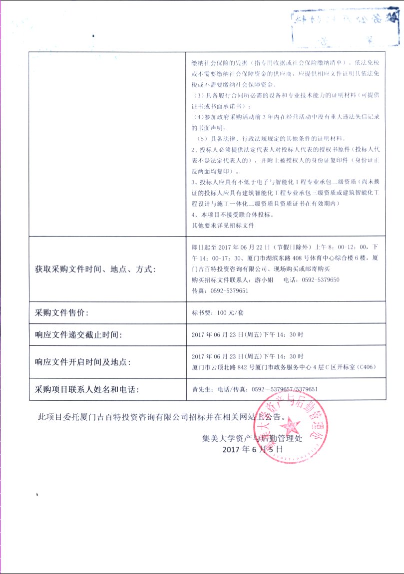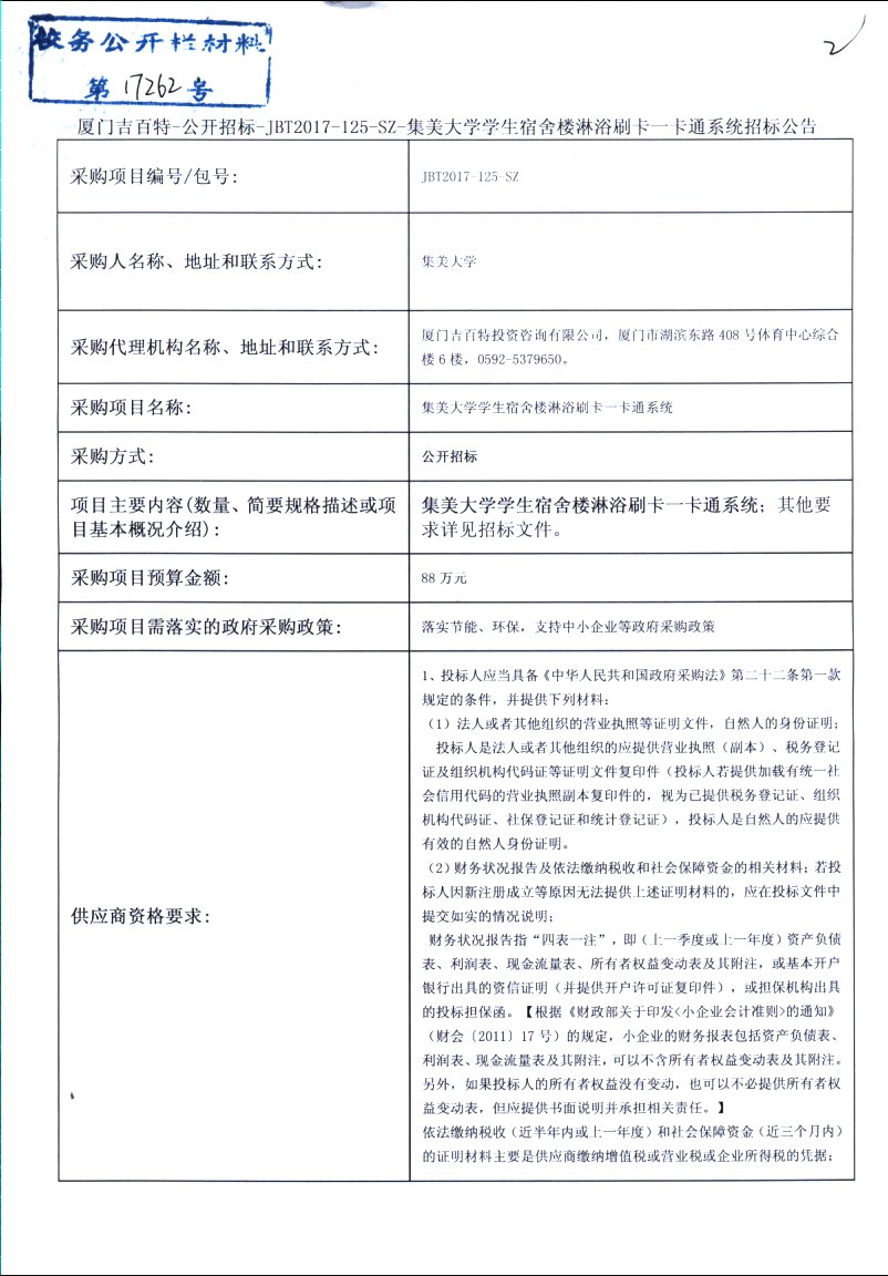 厦门吉百特-公开招标-JBT2017-125-SZ-集美大学学生宿舍楼淋浴刷卡一卡通系统招标公告