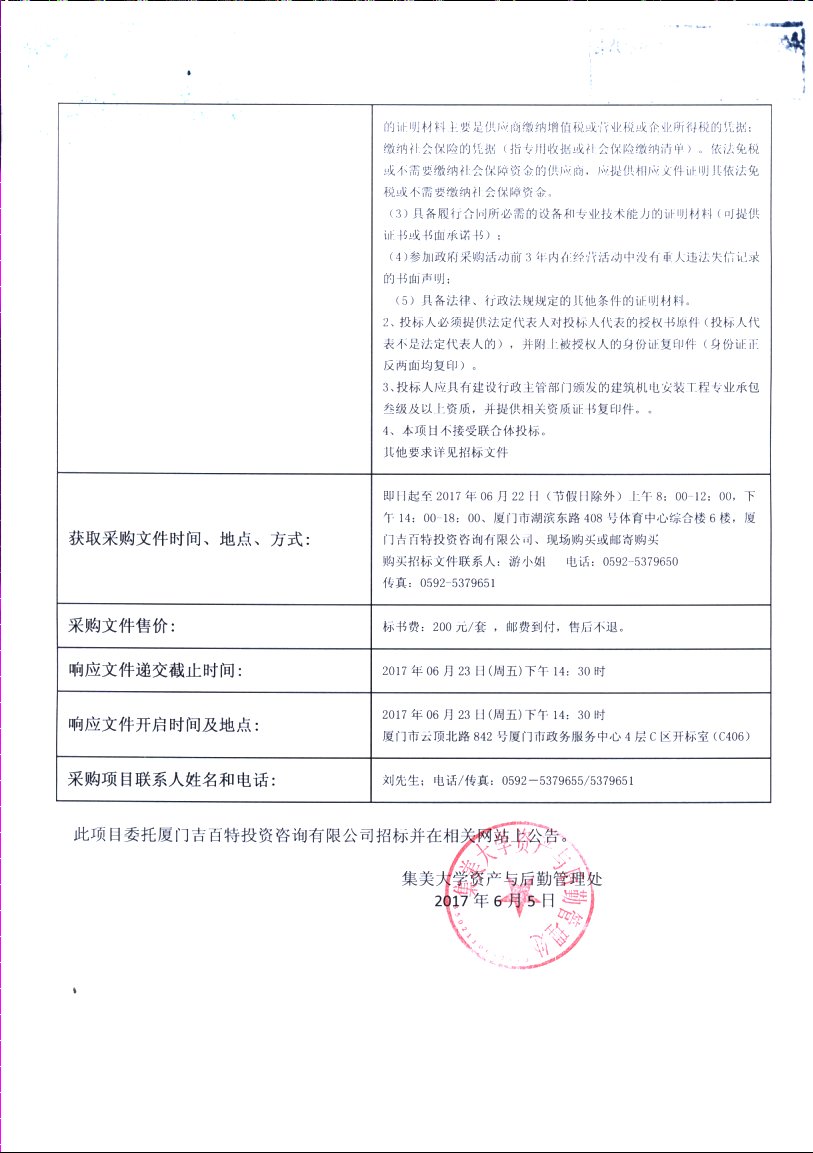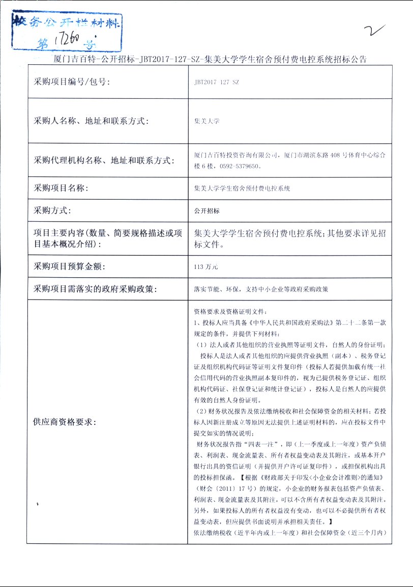 厦门吉百特-公开招标-JBT2017-127-SZ-集美大学学生宿舍预付费电控系统招标公告